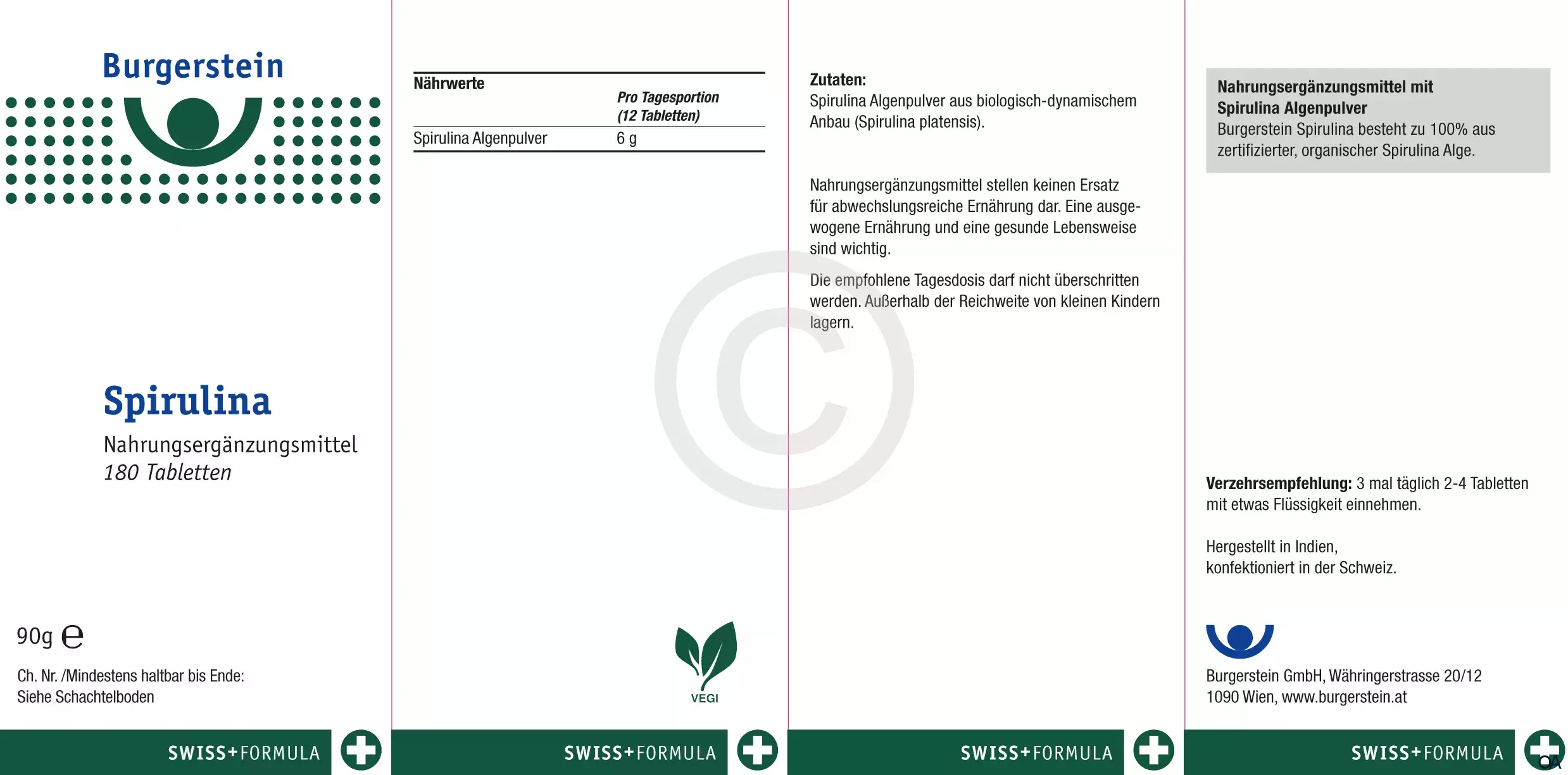 Burgerstein Spirulina Tabletten enthalten Spirulina – eine Süsswasseralge aus kontrolliertem, biologischem Anbau und ist heute als Superfood bekannt. Burgerstein Spirulina wird idealerweise zwischen den Mahlzeiten eingenommen.