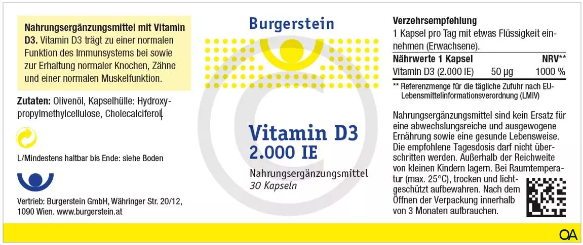 • Nährwertdeklaration Pro Tagesportion (1 Kapsel ETD*): Vitamin D3 (2.000 I.E.) 50 µg (1000%) *ETD = Referenzmenge für die tägliche Zufuhr nach EU-Lebensmittelinformationsverordnung (LMIV)