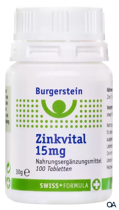 Burgerstein Zinkvital enthält pro Tablette 15 mg Zink in Form von organischem Zinkbisglycinat und ist daher sehr gut verwertbar. Die kleinen runden Tabletten ermöglichen eine einfache Einnahme. Zink trägt zur normalen Fruchtbarkeit und Reproduktion der Spermien bei, sowie zur Erhaltung von Haut, Haaren, Nägeln, Knochen und der Sehkraft. Auch das Immunsystem ist auf eine ausreichende Versorgung mit Zink angewiesen.
