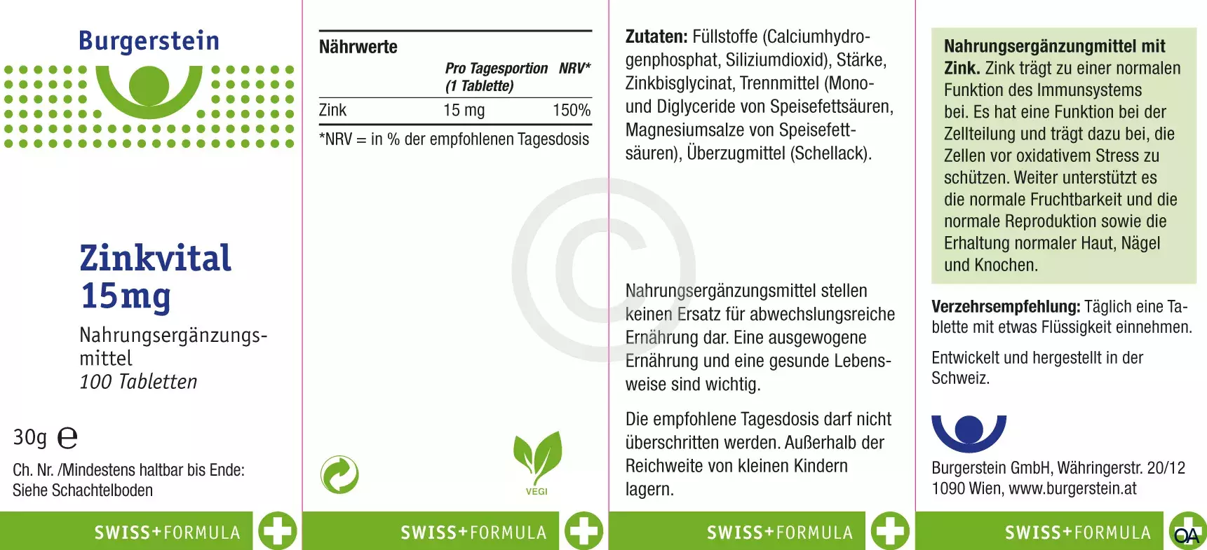 - Nährwertdeklaration Pro Tagesportion (1 Tbl. ETD*): Zink 15 mg (150%) *ETD = in % der empfohlenen Tagesdosis