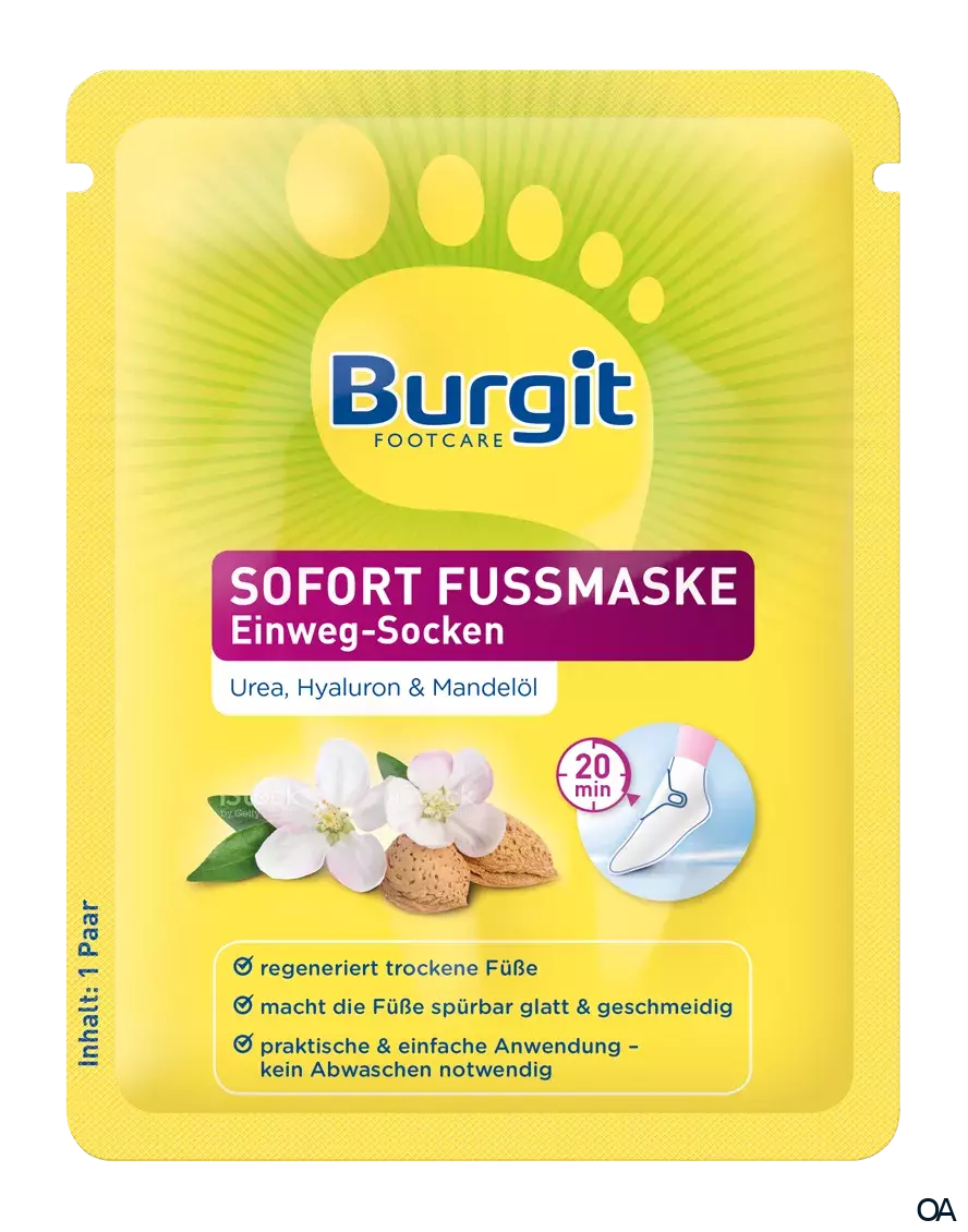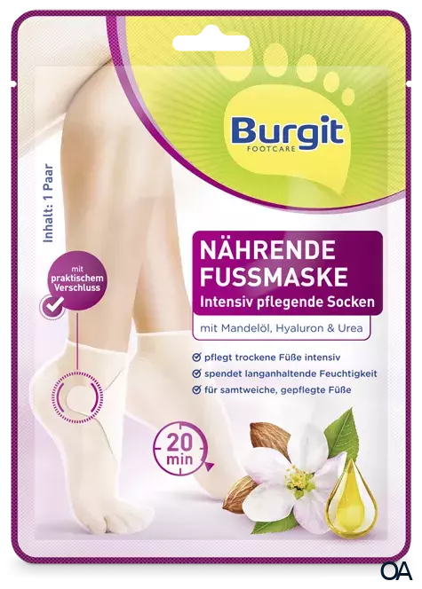 Die Burgit Nährende Fußmaske in Sockenform ermöglicht den Spa-Moment für zu Hause. Ganz einfach wie Socken anziehen, 20 Minuten einwirken lassen und voilà: die Füße sind intensiv gepflegt und samtweich, wie nach einer Pediküre.