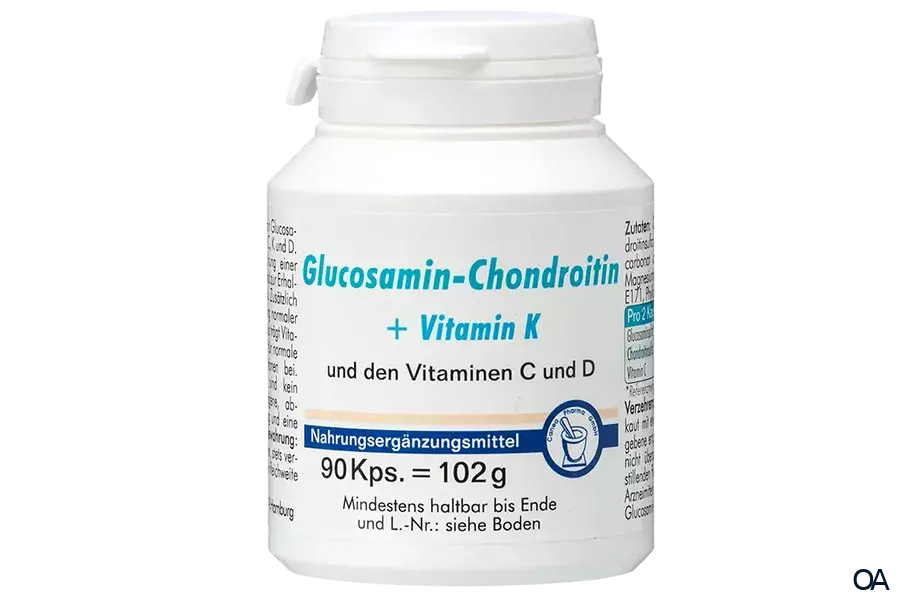 - Zutaten: Glucosaminsulfat (2KCl) (Krebstiere), Chondroitinsulfat, Gelatine (Rind), L-Ascorbinsäure, Calciumcarbonat, Trennmittel Magnesiumsalze der Speisefettsäuren, Farbstoff Calciumcarbonat, Phyllochinon, Cholecalciferol.