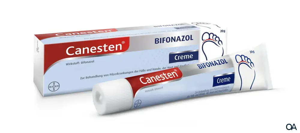 Canesten Bifonazol - Creme ist ein Breitspektrum – Antimykotikum zur Behandlung von Pilzerkrankungen (Mykosen) der Haut. Pilzerkrankungen können an praktisch jeder Stelle des Körpers auftreten; besonders gefährdet sind Körperstellen, an denen Haut auf Haut liegt, also zwischen den Zehen, in der Leistengegend oder in der Achselhöhle. Bifonazol, der Wirkstoff in Canesten Bifonazol Creme, dringt in die befallenen Hautschichten ein und tötet dort den Pilz ab.