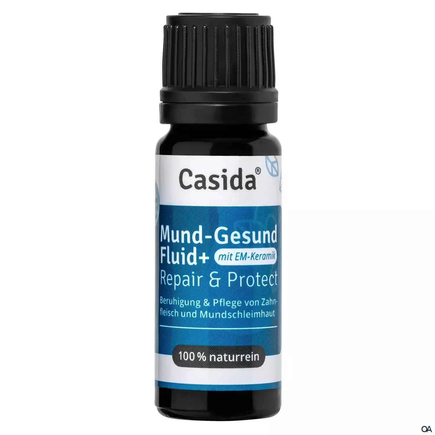 Das Casida Mund-Gesund Fluid+ mit EM-Keramik Repair & Protect ist ein bewährtes Mittel zur Pflege bei Aphten und Druckstellen durch Prothesen und Implantate.