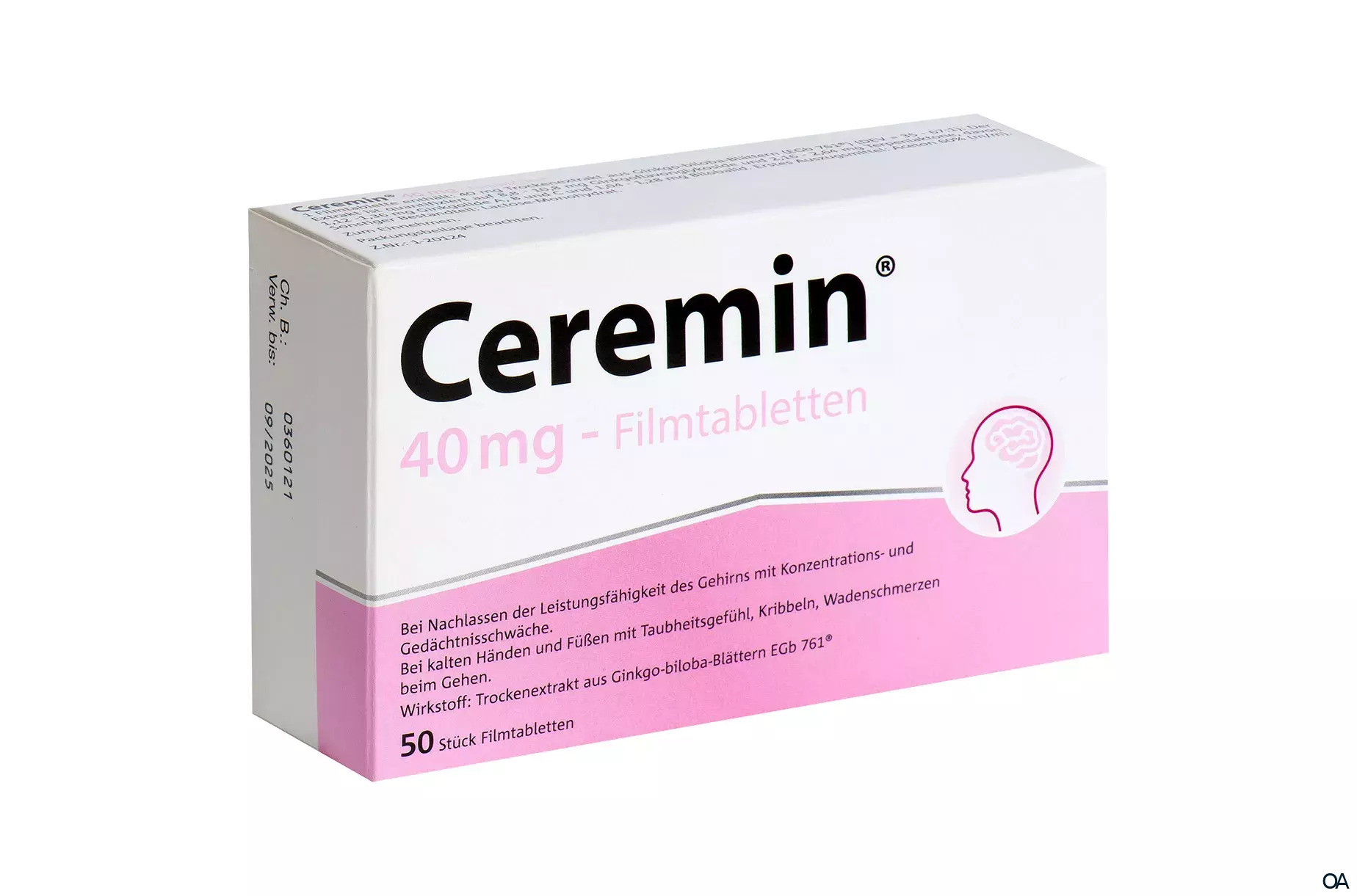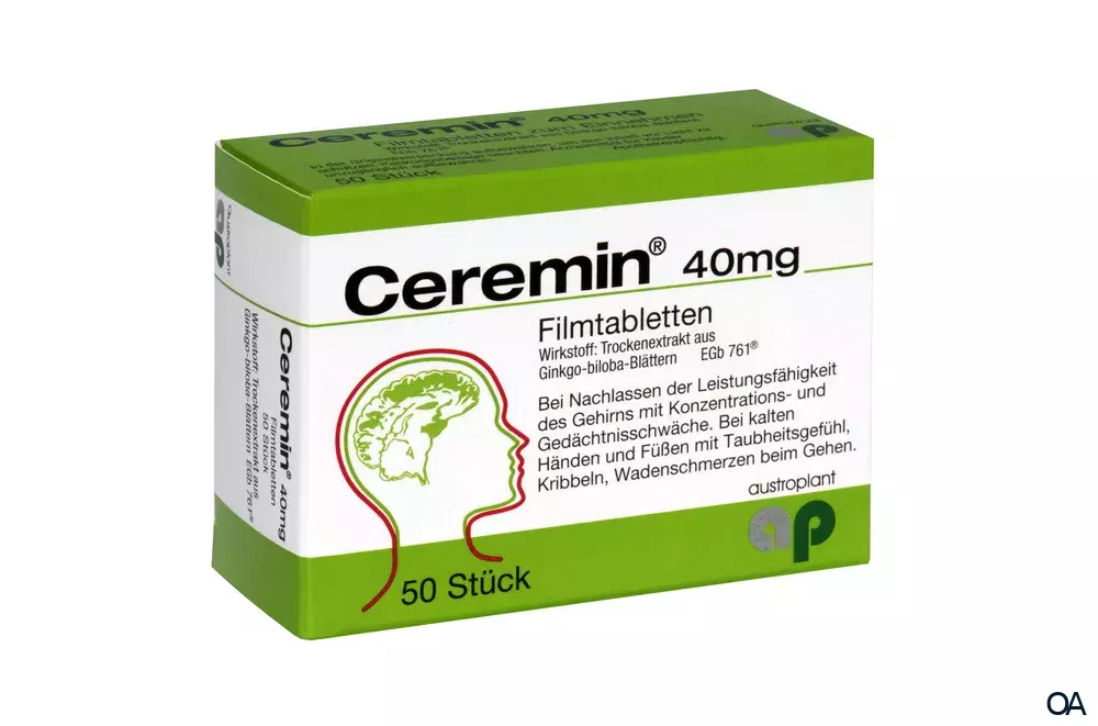 Ceremin 40 mg Filmtabletten sind ein pflanzliches Arzneimittel zur Einnahme bei Nachlassen der Leistungsfähigkeit des Gehirns mit Konzentrations- und Gedächtnisschwäche, kalten Händen und Füßen mit Taubheitsgefühl, Kribbeln oder Wadenschmerzen beim Gehen.