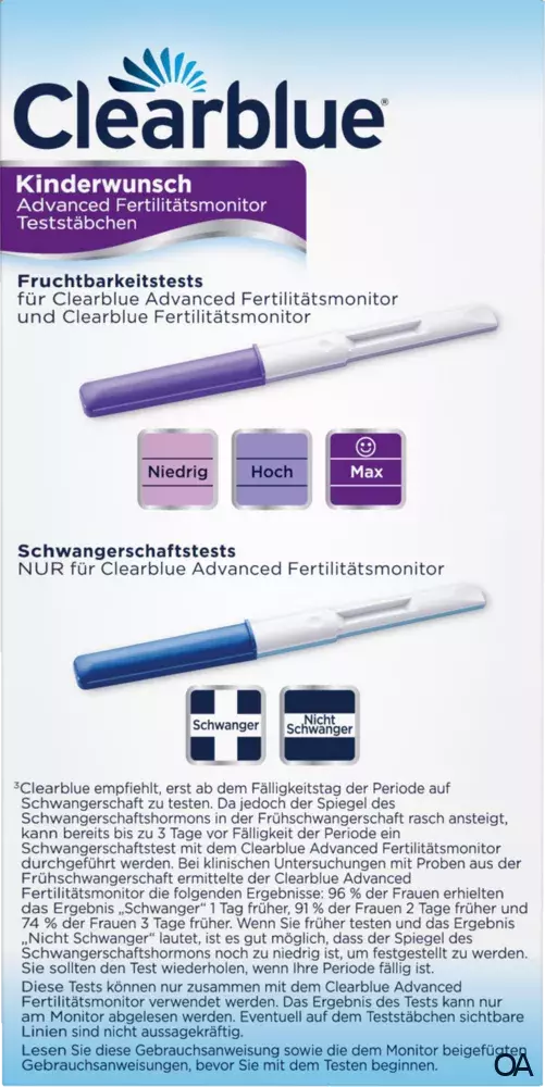 - Die Fruchtbarkeitsteststäbchen aus dieser Packung können nur mit dem Clearblue Fertilitätsmonitor Advanced (separat erhältlich) oder dem Clearblue Fertilitätsmonitor verwendet werden; sie funktionieren nicht mit unseren anderen Clearblue Ovulationstests.