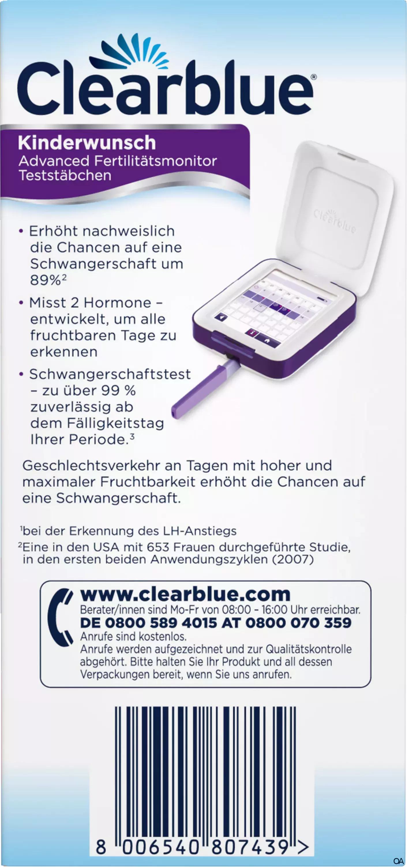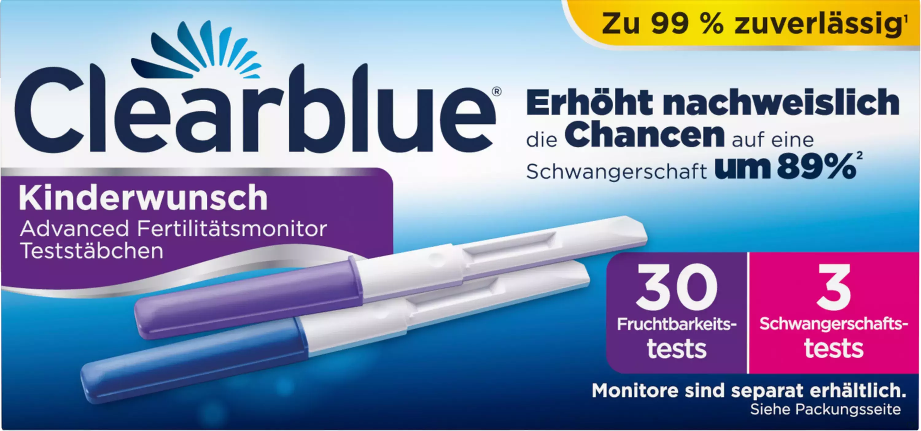 - Der Clearblue Fertilitätsmonitor Advanced (nicht enthalten) erhöht nachweislich die Chancen, auf natürliche Weise schwanger zu werden, um 89 % (1)
