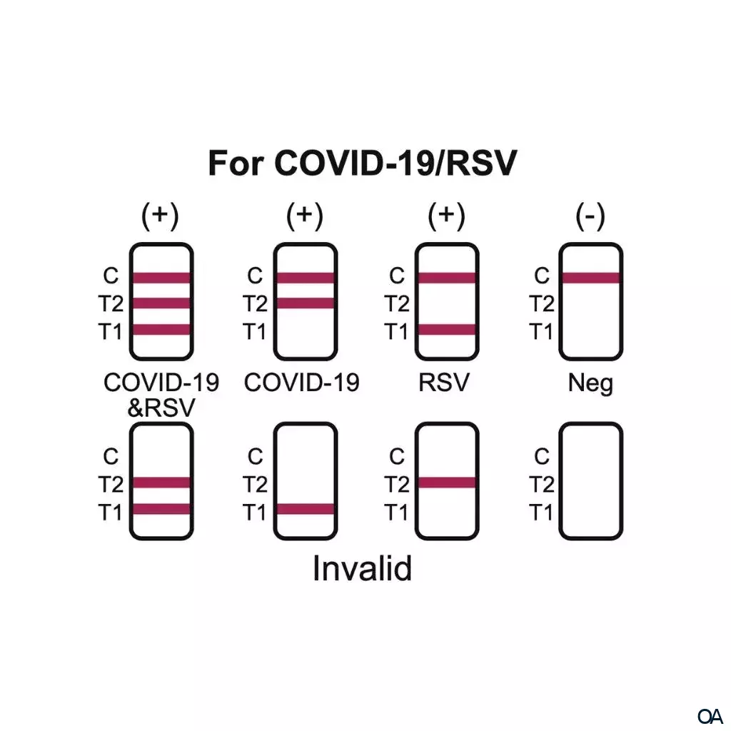 - Das RSV-Antigen in der Probe verband sich mit dem mit kolloidalem Gold markierten monoklonalen RSV-Antikörper, um einen Komplex zu bilden, der dann mit dem monoklonalen Maus-Anti-RSV-Antikörper, der während der Chromatographie in die Testlinie T1 beschichtet wurde, verbunden wurde; zu diesem Zeitpunkt gibt es eine rote Linie im T1-Bereich (Der Test ist positiv). Wenn die Proben keine COVID-19- und RSV-Antigene enthalten, gibt es keine roten Linien in den Bereichen T1 und T2 (Der Test ist negativ). Unabhängig vom Vorhandensein von COVID-19- oder RSV-Virus-Antigenen in der Probe bildet sich im Qualitätskontrollbere- ich (C) immer eine rote Linie. Die rote Linie im Qualitätskontrollbereich (C) dient zur Überprüfung, ob 1. ein ausreichendes Probenvolumen zugegeben wurde, 2. ein ordnungsgemäßer Durchfluss erzielt wurde, und 3. als Qualitätskontrolle für die Reagenzien. Sollte diese nicht auftauchen – dann darf der Test nicht ausgewertet werden.