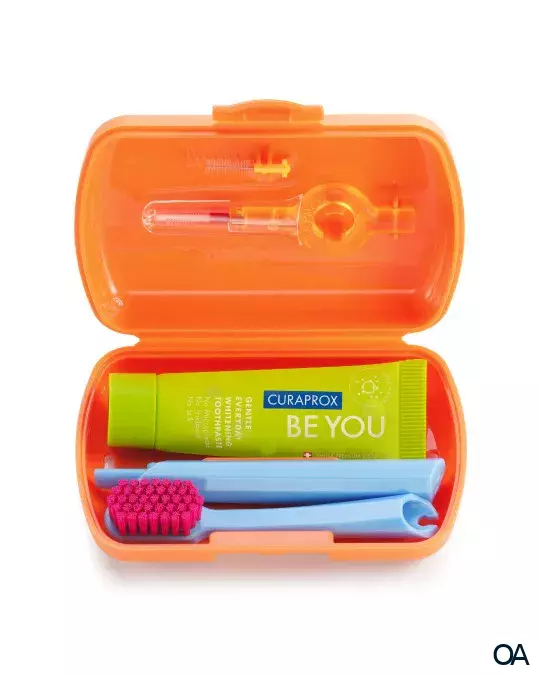 Das Curaprox Reise-Set enthält eine kompakte Reisezahnbürste, 10 ml raffiniert-frische Whitening-Zahnpasta und zwei Interdentalbürsten mit praktischem Halter – perfekte Mundhygiene, wo immer du gerade bist.