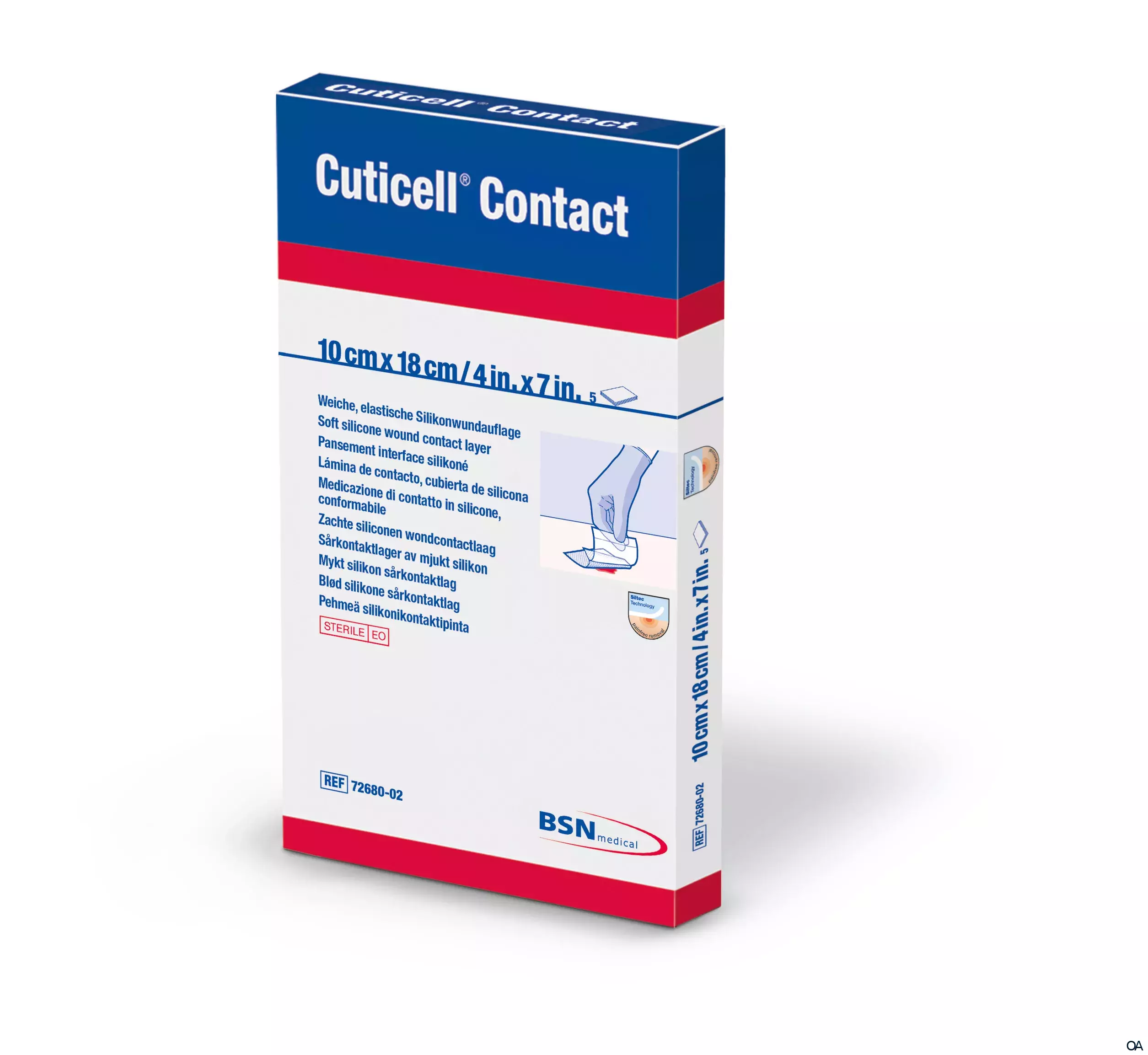 Cuticell® Contact besteht aus einem dünnen, elastischen Polyurethanfilm, der einseitig mit weichem Silikon beschichtet ist.