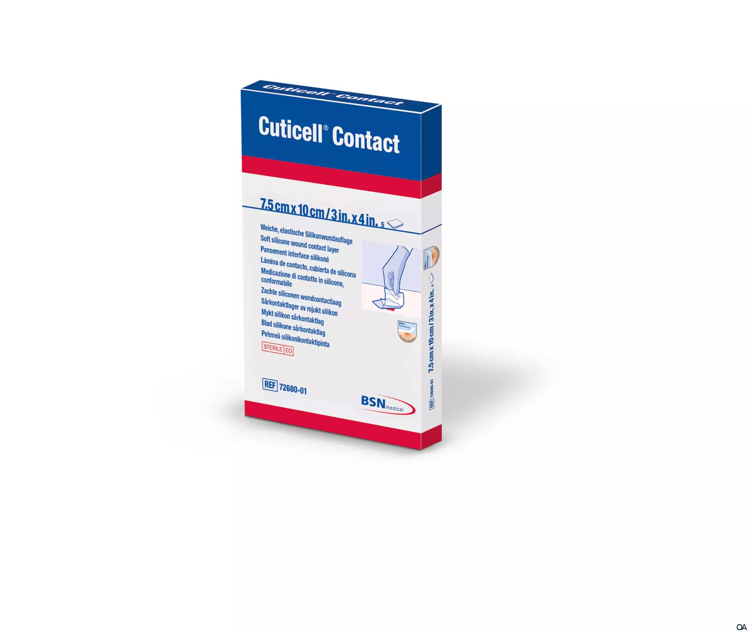 Cuticell® Contact ist eine sterile Primärauflage für schwach bis stark exsudierende Wunden, die an der Wundumgebung haftet, aber nicht auf der feuchten Wunde (Siltec®-Technologie).