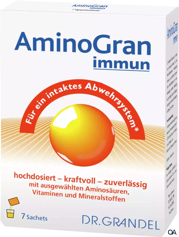 Das Immunsystem muss stets in der Lage sein, die täglichen Belastungen abzuwehren. *Die Vitamine A, C, B6, B12 und Folsäure, sowie die Spurenelemente Zink, Kupfer und Selen tragen zu einer normalen Funktion des Immunsystems bei. Eine Kombination von spezifischen Aminosäuren mit weiteren ausgewählten Vitaminen und Mineralstoffen rundet AminoGran immun ab.