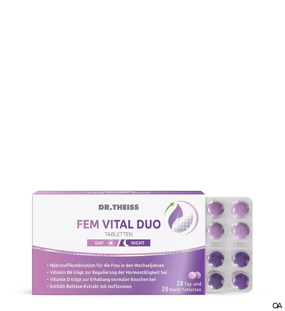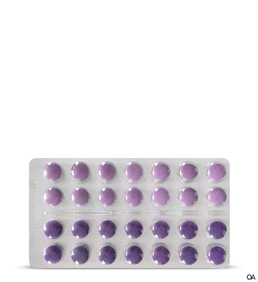 Tabletten (56 Tabletten = entspricht 28 Tagesportionen). Je 28 Tag-Tabletten (hell-lila) und