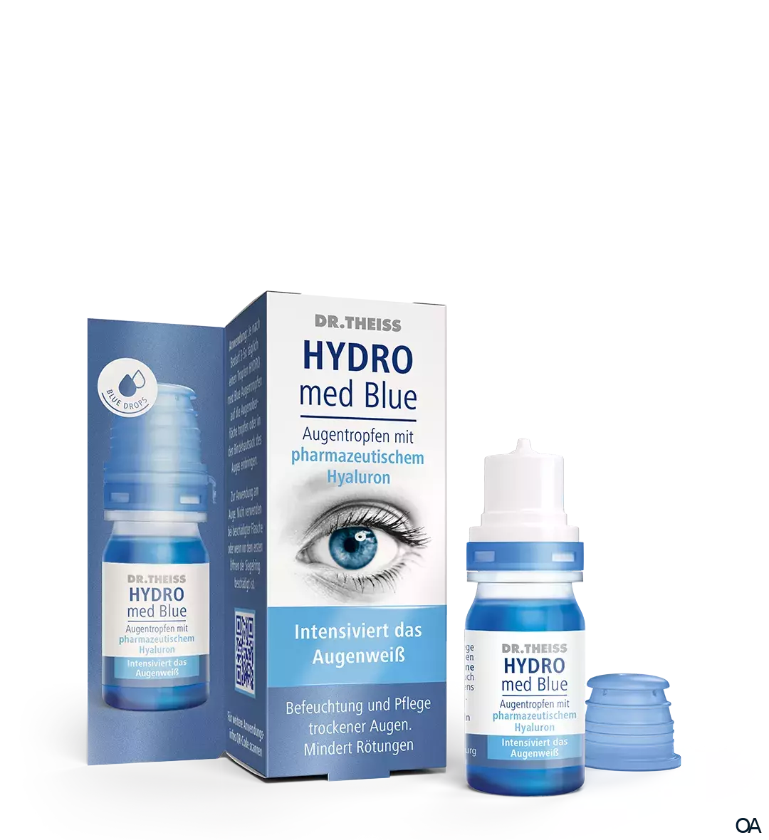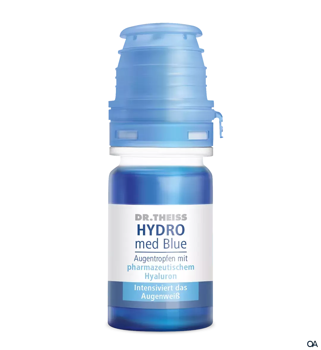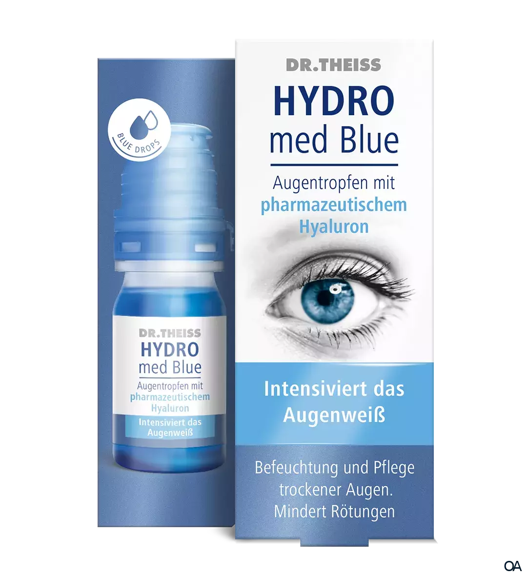 DR. THEISS HYDRO med Blue Augentropfen sind ein Medizinprodukt mit pharmazeutischem Hyaluron. Befeuchtung und Pflege trockener Augen, mindert Rötungen und intensiviert das Augeneiweiß.
