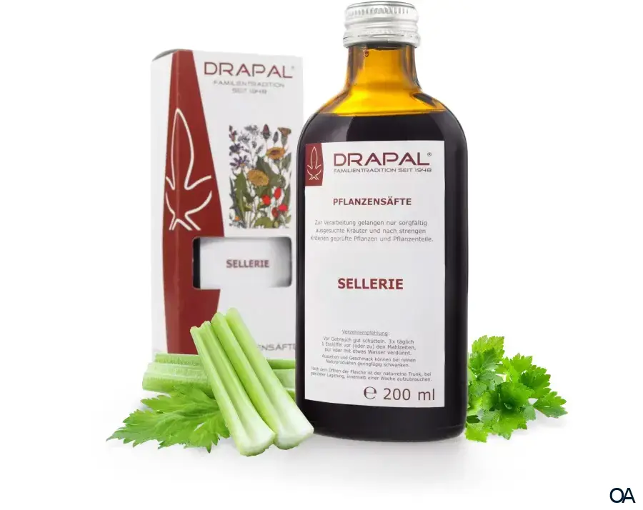 DRAPAL Pflanzensäfte - mit der Kraft der Natur. Sortenrein und wirksam. Sellerie ist eine harntreibende Pflanze und wird bei rheumatischen Beschwerden, zur "Blutreinigung" und bei Gicht verwendet. Die enthaltenen Phtalide besitzen eine blutdrucksenkende Wirkung.