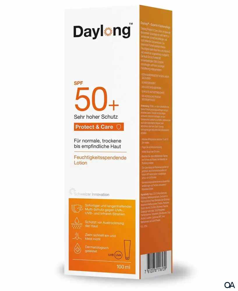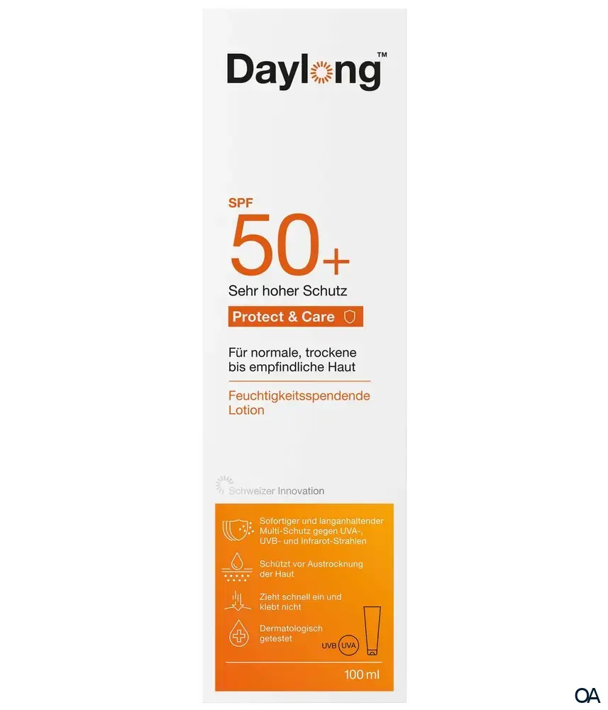 Verwöhnen Sie Ihre Haut mit Daylong™ Protect & Care SPF 50+. Die liposomale/feuchtigkeitsspendende Lotion pflegt intensiv und schützt zuverlässig vor Sonne. Schnelleinziehende Formel mit Lichtschutzfaktor 50+ gegen UVA- und UVB Strahlung.
