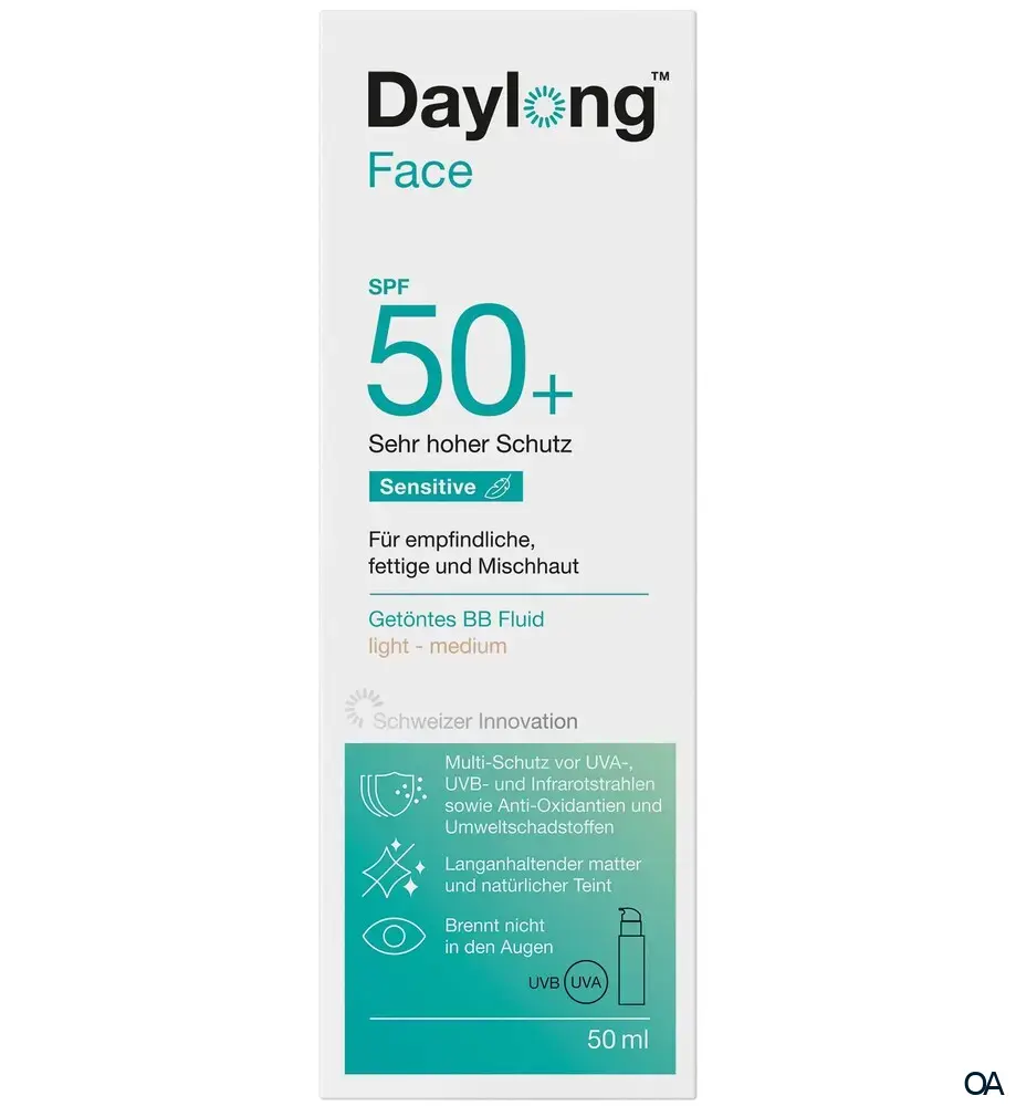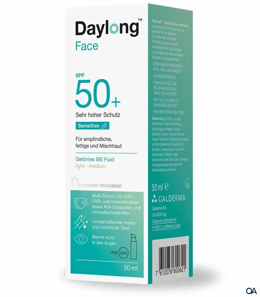 Das ultraleichte Fluid reguliert darüber hinaus die Produktion von Talg (Sebum) und sorgt so langanhaltend dafür, dass sich Ihre Gesichtshaut angenehm matt anfühlt und Ihr Teint erhalten bleibt. Daylong Face getöntes BB Fluid SPF 50+ ist also die ideale Make-Up Grundlage für jeden Tag und ist zudem Ihr täglicher Partner im Kampf gegen Hautalterung.