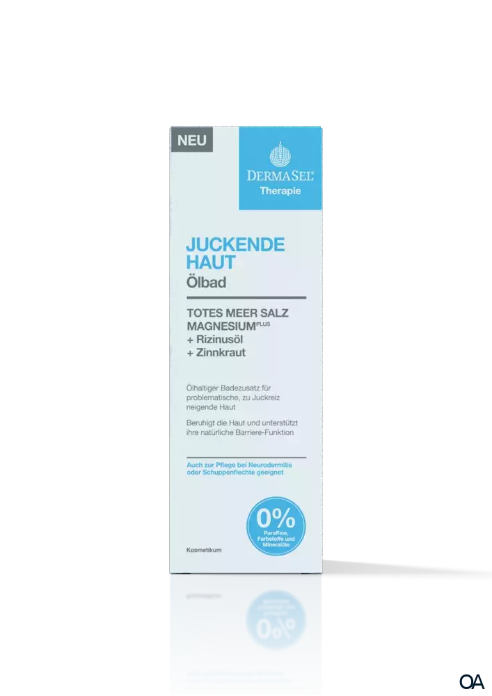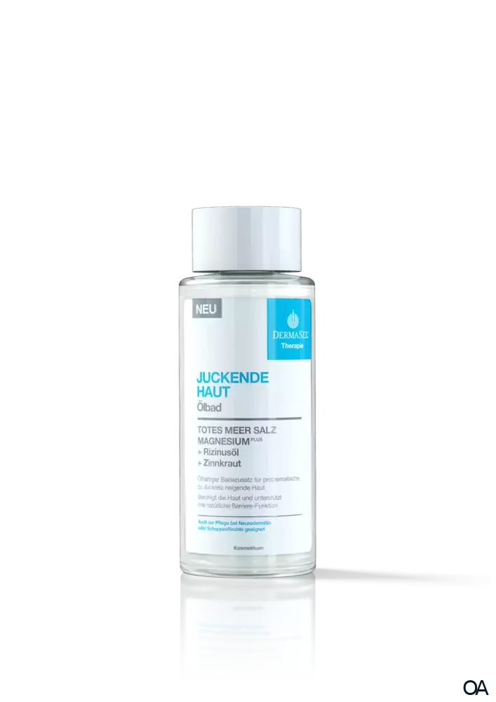 Das DermaSel® Therapie Ölbad für Juckende Haut mit wertvolle Zusätze wie Rizinusöl und Zinnkraut beruhigt und entspannt die Haut. Original Totes Meer Salz mit MagnesiumPLUS versorgt die sie intensiv mit Feuchtigkeit und hilft ihr dabei, die Feuchtigkeit zu bewahren. Das enthaltene Rizinusöl ist reich an ungesättigten Fettsäuren und kann zudem die Kollagenproduktion in der Haut anregen. Dank dieser Eigenschaften bleibt die Haut elastisch und Juckreiz kann gemindert werden. Zusätzlich wirkt Rizinusöl entzündungshemmend, womit es der Haut dabei helfen kann, wieder einen ausgeglichenen und beruhigten Status zu erreichen. Das enthaltene Zinnkraut wirkt entzündungshemmend und wundheilend und kann somit helfen Juckreiz und seine Begleiterscheinungen zu lindern.