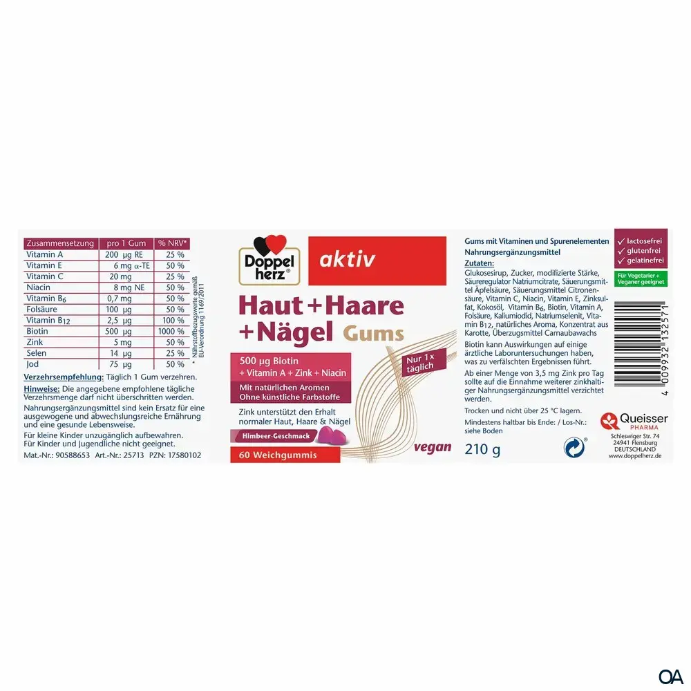 Entdecken Sie die leckeren Doppelherz Haut + Haare + Nägel Gums mit Himbeergeschmack. Die vegane Formel mit hochdosiertem Biotin und Zink unterstützt den Erhalt normaler Haut, kräftiger Haare und fester Nägel. Einfach genießen für Ihre Schönheit!