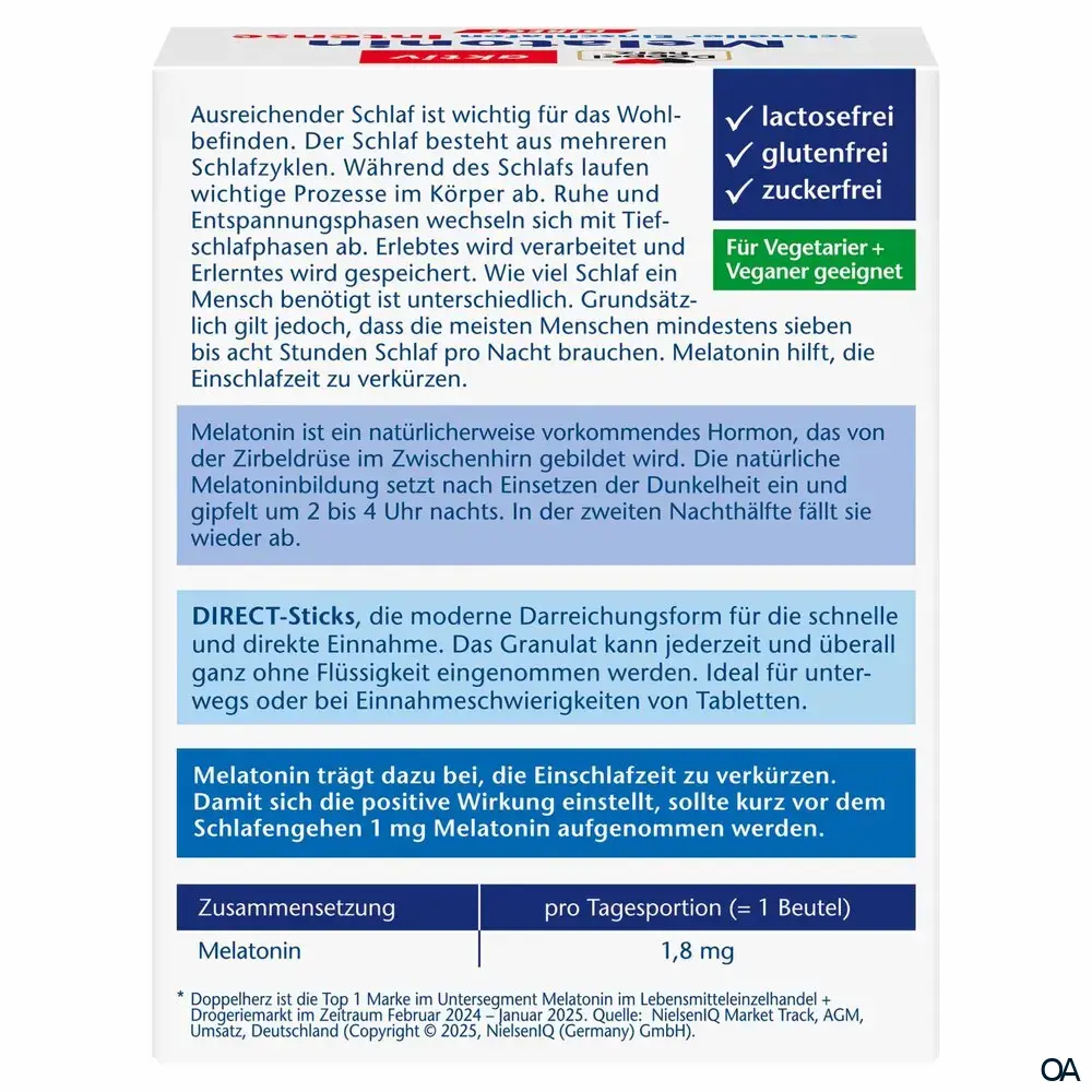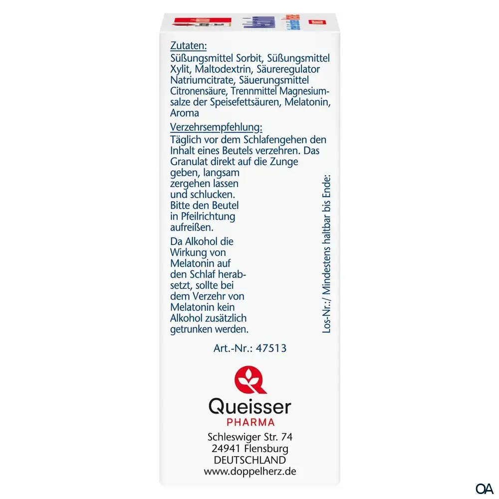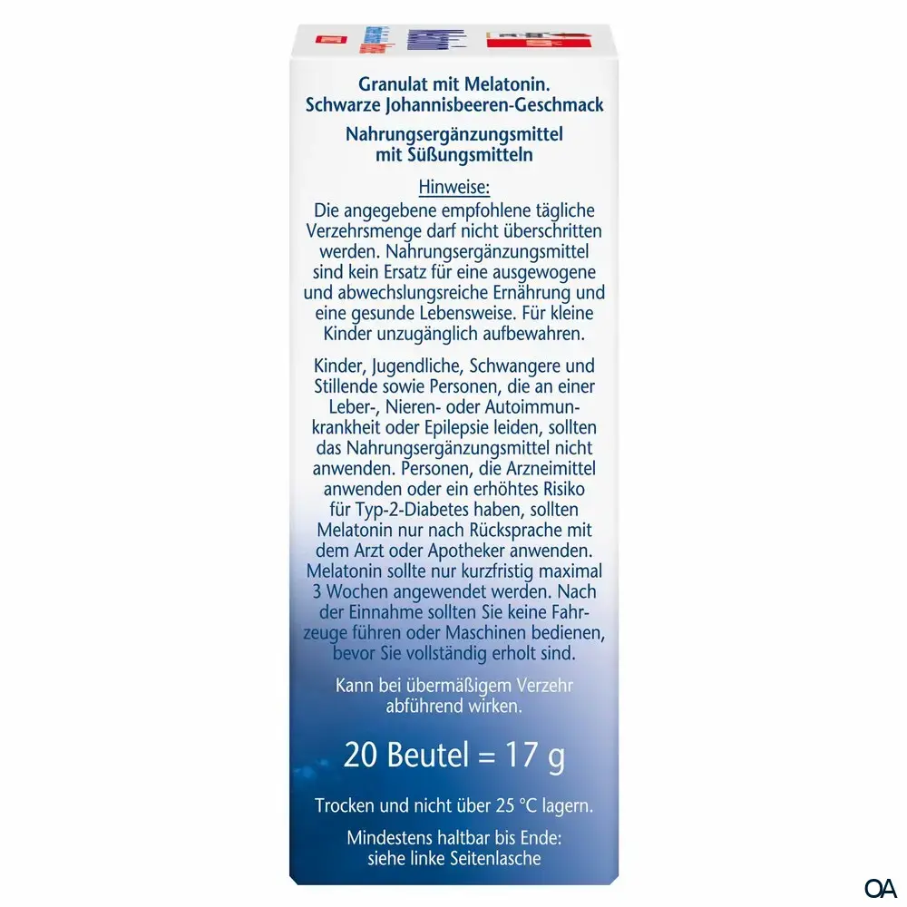 - Zusammensetzung pro Tagesdosis (1 Beutel): Melatonin 1 mg.
