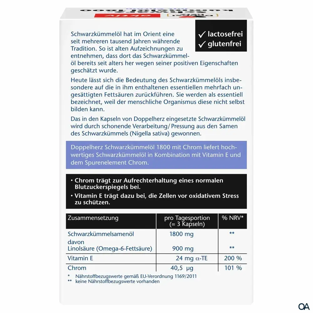 - Zusammensetzung pro Tagesdosis (3 Kapseln) %NRV*: Schwarzkümmelsamenöl 1800 mg ** davon Linolsäure (Omega-6 Fettsäure) 900 mg **, Vitamin E 24 mg α-TE 200 %, Chrom 40,5 µg 101 %. * Nährstoffbezugswerte gemäß EU-Verordnung 1169/2011. ** Keine Nährstoffbezugswerte vorhanden.
