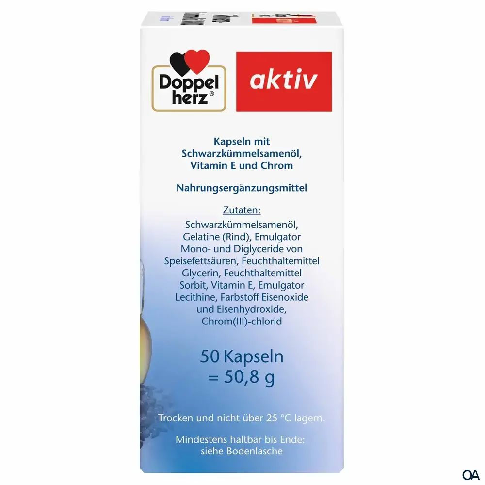 - Zutaten: Schwarzkümmelsamenöl, Gelatine (Rind), Emulgator Mono- und Diglyceride von Speisefettsäuren, Feuchthaltemittel Glycerin, Feuchthaltemittel Sorbit, Vitamin E, Emulgator Lecithine, Farbstoff Eisenoxide und Eisenhydroxide, Chrom(III)-chlorid.