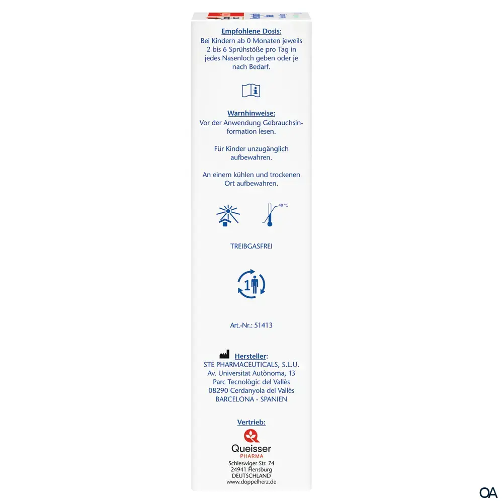 - Bei Kindern ab 0 Monaten jeweils 2 bis 6 Sprühstöße pro Tag in jedes Nasenloch geben oder je nach Bedarf.