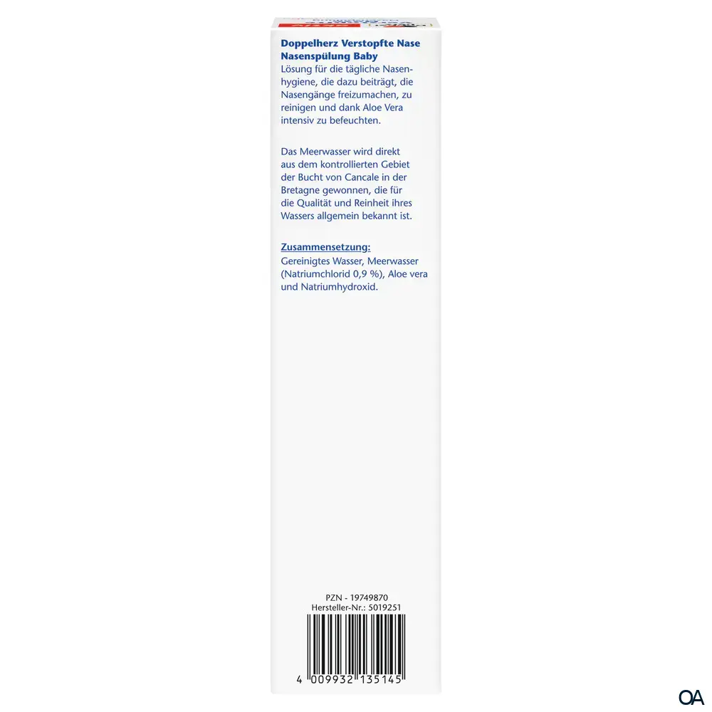Doppelherz Verstopfte Nase Nasenspülung Baby ist ein treibgasfreies Nasenspray auf Basis einer isotonischen Meerwasserlösung (0,9 % Natriumchlorid) mit natürlichen Meeresmineralien und Spurenelementen sowie natürlichem Aloe-Vera-Extrakt.