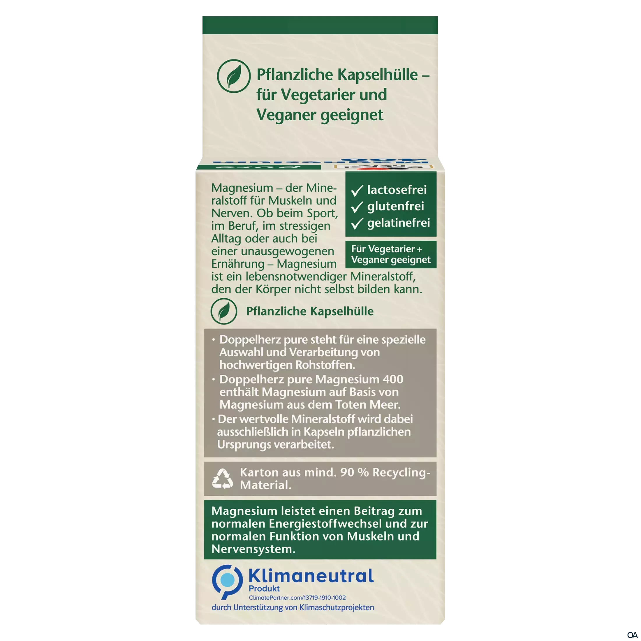 Doppelherz pure Magnesium 400 enthält Magnesium auf Basis von Magnesium aus dem Toten Meer in pflanzlichen Kapseln.