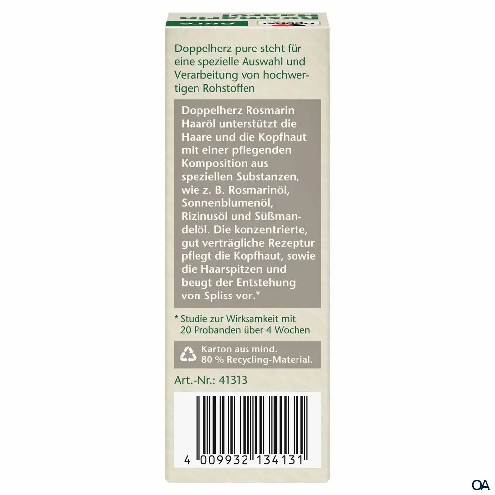Mit einer natürlichen Mischung aus Rosmarin-, Rizinus- und Süßmandelöl sorgt Doppelherz Rosmarin Haaröl für eine sanfte und zugleich wirkungsvolle Pflege von Haar und Kopfhaut. Die konzentrierte, gut verträgliche Rezeptur pflegt die Kopfhaut, sowie die Haarspitzen und beugt der Entstehung von Spliss vor.*