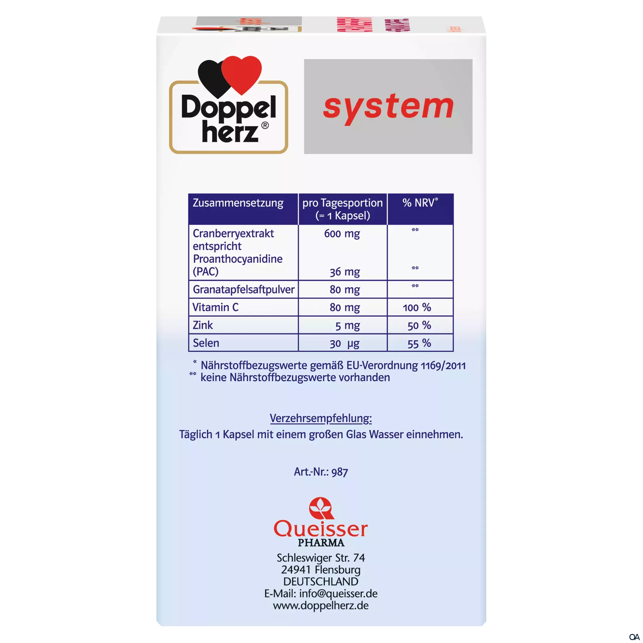 Doppelherz system Cranberry + Granatapfel Kapseln sind ein Nahrungsergänzungsmittel mit 600 mg hochwertiger Cranberryextrakt mit 36 mg PAC kombiniert mit 80 mg Granatapfelsaftpulver pro Kapsel.