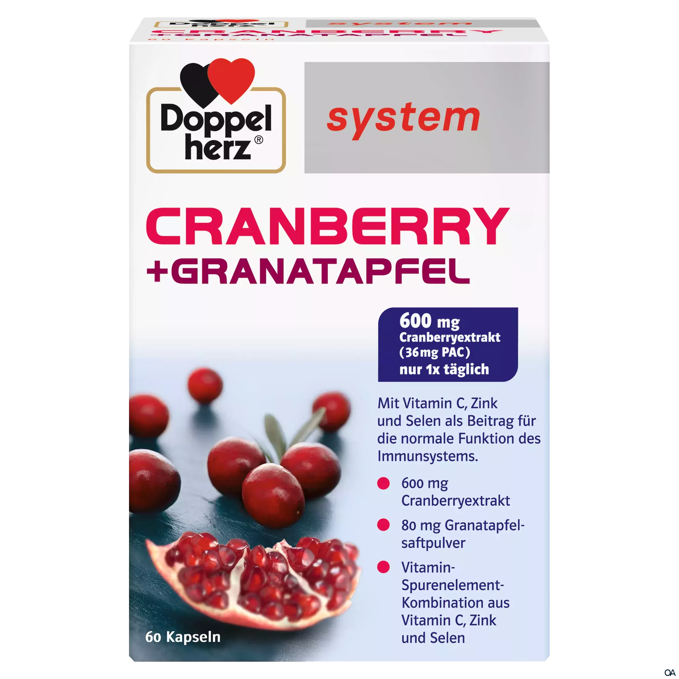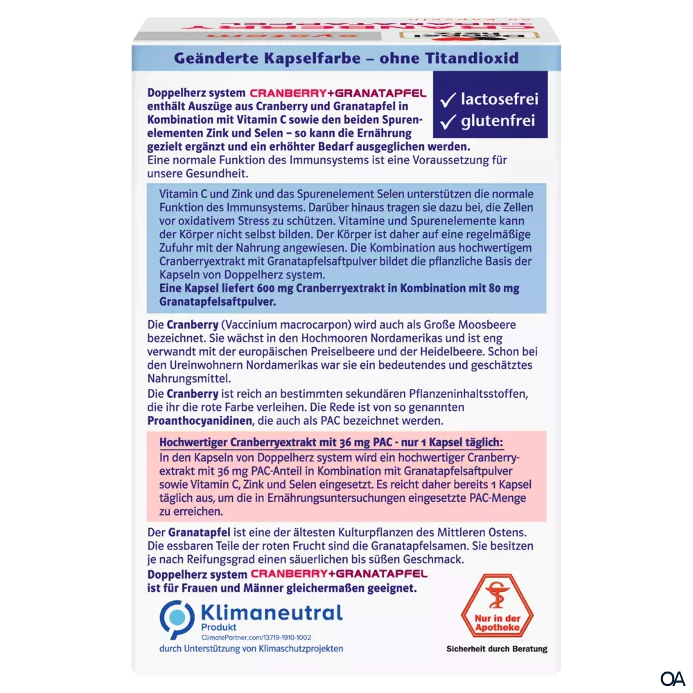 - Cranberries sind reich an bestimmten sekundären Pflanzenstoffen, die ihr die rote Farbe verleihen. Die Rede ist hier von so genannten Proanthocyanidinen, die auch als PAC bezeichnet werden. In den Kapseln von Doppelherz system wird ein hochwertiger Cranberryextrakt mit 36 mg PAC-Anteil in Kombination mit Granatapfelsaftpulver sowie Vitamin C, Zink und Selen eingesetzt. Es reicht daher bereits 1 Kapsel täglich aus, um die in Ernährungsuntersuchungen eingesetzte PAC-Menge zu erreichen.