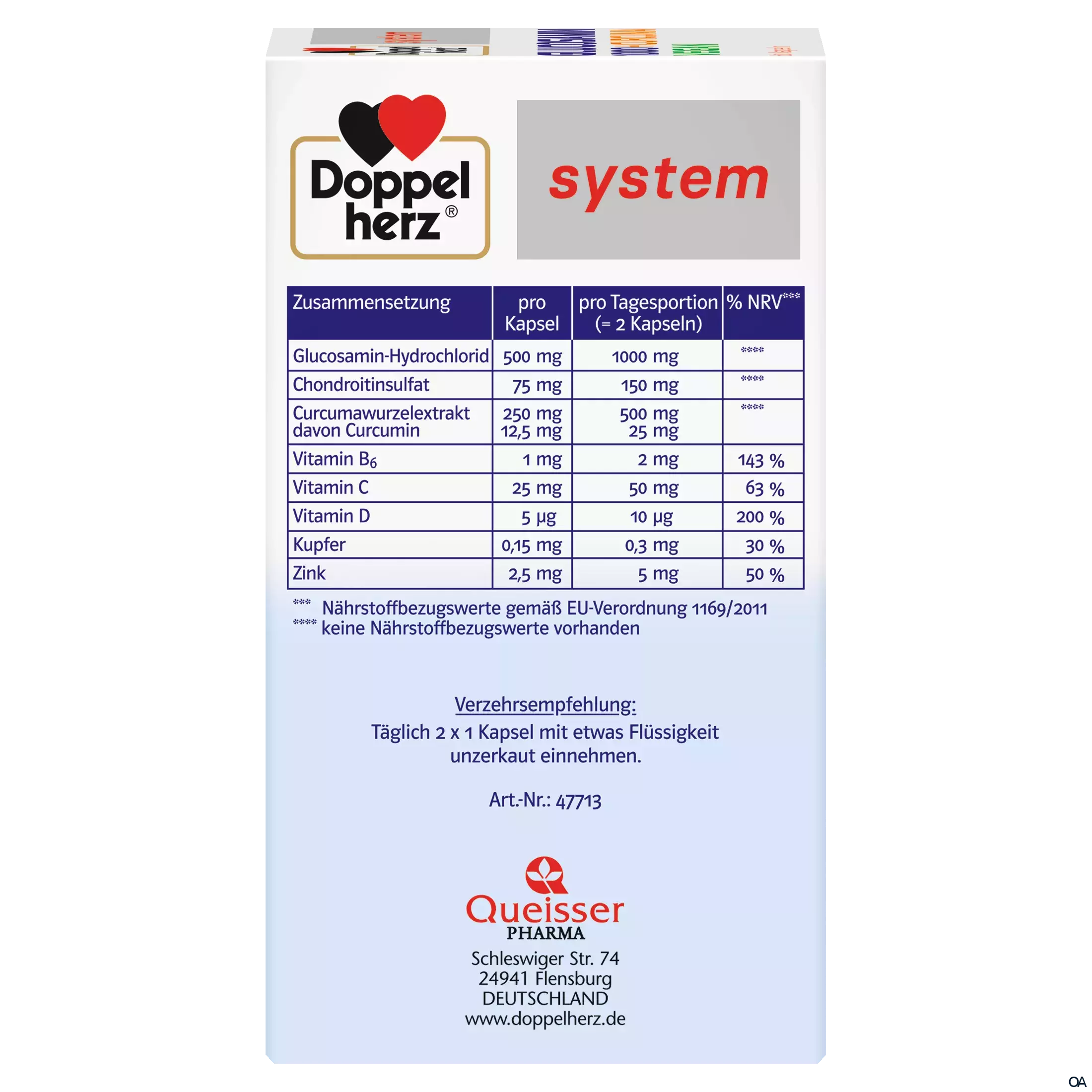 Doppelherz system GLUCOSAMIN 1000 + CURCUMA VEGAN enthält eine spezielle Kombination der lebenswichtigen Mikronährstoffe Kupfer, Zink, Vitamin C, Vitamin B6 und Vitamin D. Zusätzlich sind 1.000 mg Glucosamin-Hydrochlorid, 150 mg Chondroitinsulfat und 500 mg Curcumawurzelextrakt bei Einnahme von 2 Kapseln enthalten.