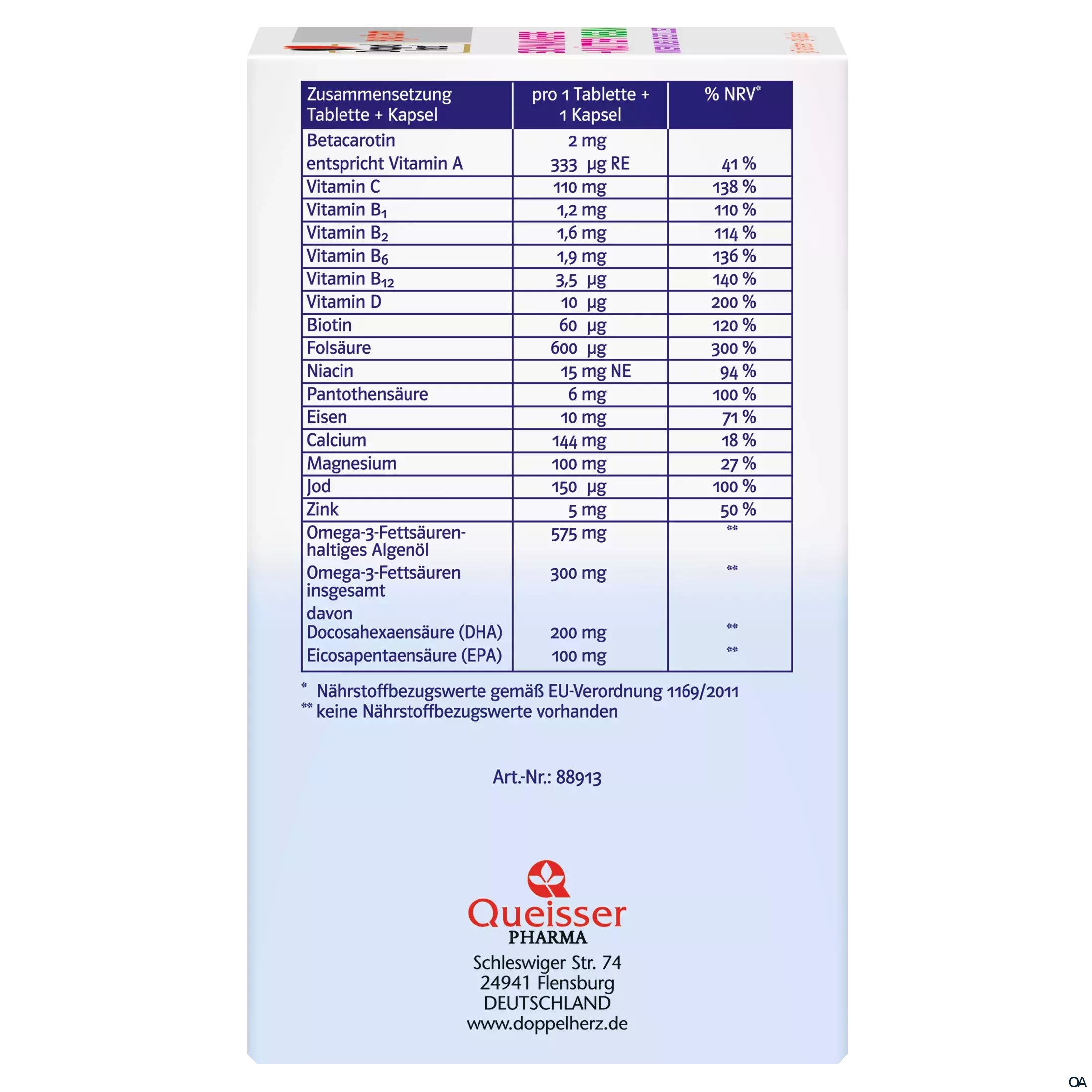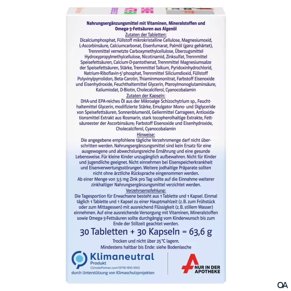 - Zusammensetzung pro Kapsel + Tablette % NRV*: Beta-Carotin 2 mg entspricht Vitamin A 333 µg RE 41 %, Vitamin C 110 mg 138 %, Vitamin B1 1,2 mg 110 %, Vitamin B2 1,6 mg 114 %, Vitamin B6 1,9 mg 136 %, Vitamin B12 3,5 µg 140 %, Vitamin D 10 µg 200 %, Biotin 60 µg 120 %, Folsäure 600 µg 300 %, Niacin 15 mg NE 94 %, Pantothensäure 6 mg 100 %, Eisen 10 mg 71 %, Calcium 131 mg 16 %, Magnesium 100 mg 27 %, Jod 150 µg 100 %, Zink 5 mg 50 %, Omega-3-Fettsäuren 300 mg **, Docosahexaensäure (DHA) 250 mg **, Eicosapentaensäure (EPA) 32,5 mg **, Vitamin E 13 mg α-TE 108 %. * Nährstoffbezugswerte gemäß EU-Verordnung 1169/2011. ** Keine Nährstoffbezugswerte vorhanden.