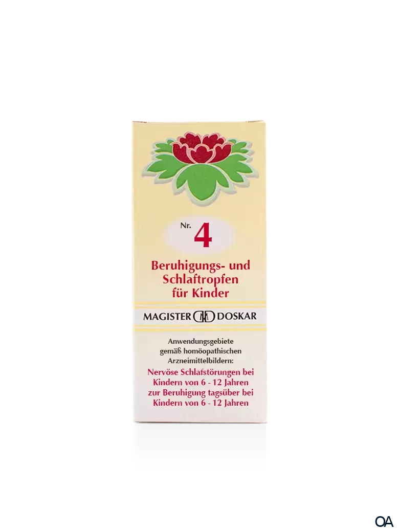 Die einzelnen Bestandteile von Nr. 4 Beruhigungs- und Schlaftropfen für Kinder “ Mag. Doskar“ üben einen regulierenden und vegetativ stabilisierenden Effekt auf das zentrale Nervensystem, besonders auf das Schlafzentrum.
