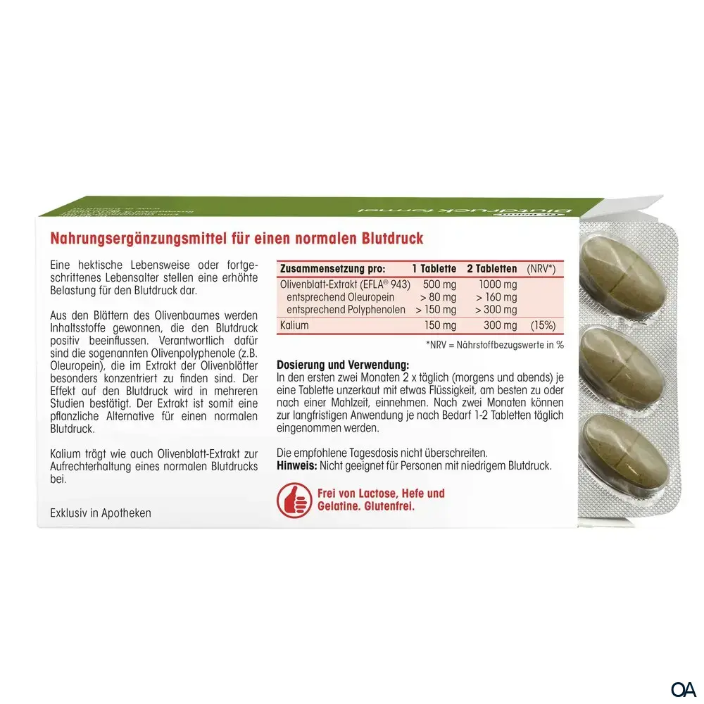 - Zusammensetzung pro Tablette (NRV*): Olivenblatt-Extrakt 500 mg entsprechend Oleuropein 100 mg, Kalium 150 mg (7,5 %). *NRV = Nährstoffbezugswerte in %.