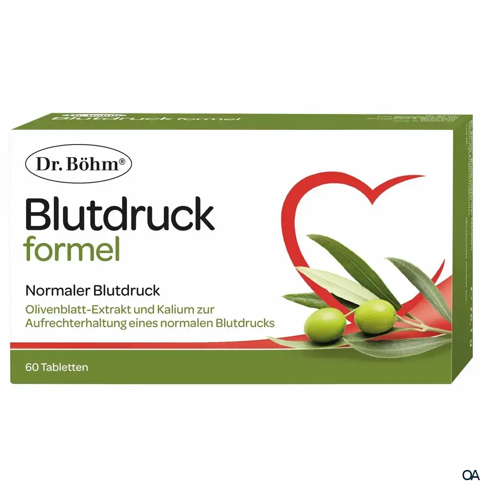 - Die Dr. Böhm Blutdruckformel kombiniert Olivenblatt-Extrakt und Kalium zur Unterstützung eines normalen Blutdrucks. Verantwortlich dafür sind vor allem die sogenannten Olivenpolyphenole (z.B. Oleuropein), die im Extrakt der Olivenblätter besonders konzentriert zu finden sind.