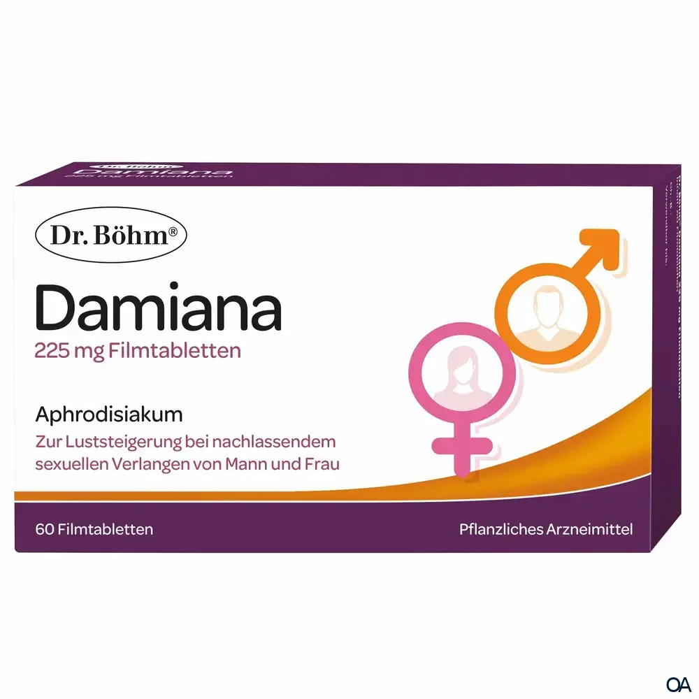 Die Dr. Böhm® Damiana 225 mg Filmtabletten sind ein traditionelles pflanzliches Arzneimittel zur Luststeigerung bei nachlassendem sexuellen Verlangen für Mann und Frau bedingt durch psychische Ursachen wie Überlastung oder stressbedingte Schwächezustände nachdem schwerwiegende Grunderkrankungen durch einen Arzt ausgeschlossen wurden.