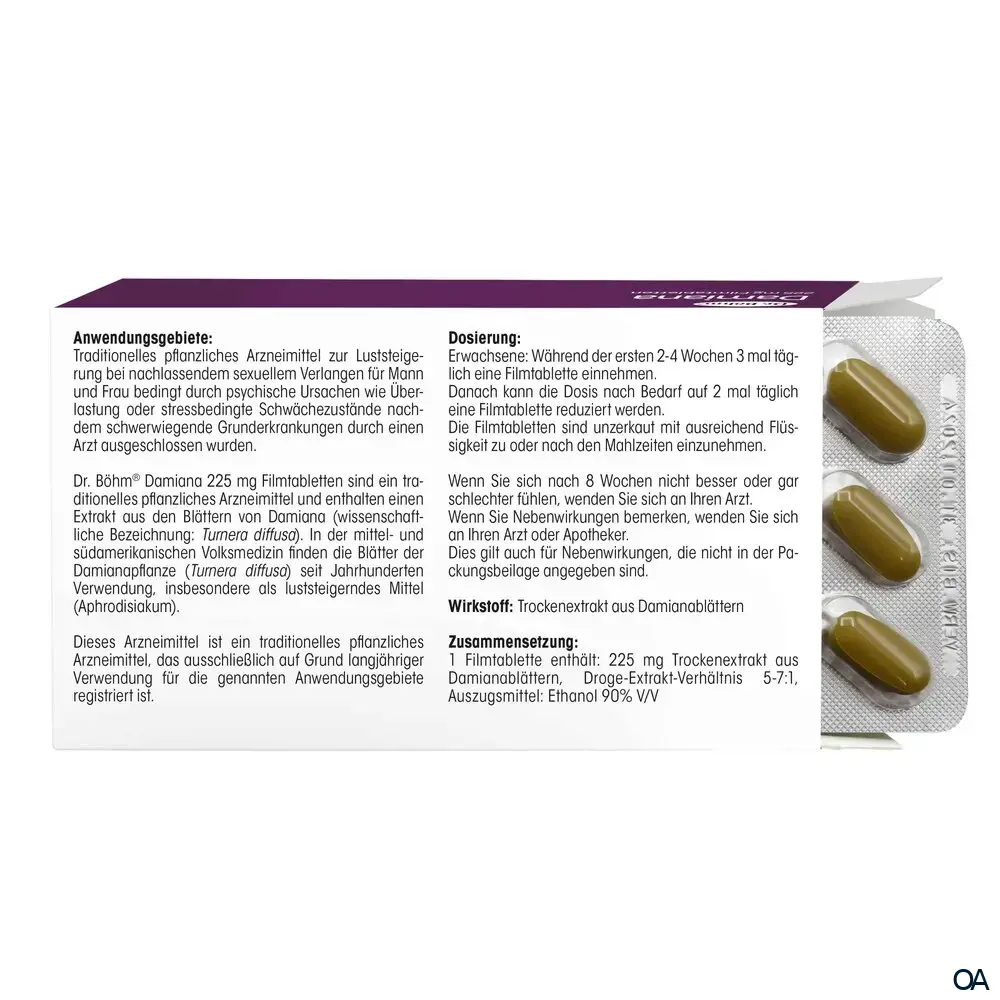 - Dauer der Anwendung: Für eine zuverlässige Wirkung sollten Dr. Böhm® Damiana 225 mg Filmtabletten über einen längeren Zeitraum eingenommen werden. Eine durchgehende Einnahme dieses Arzneimittels bis zu 12 Wochen ist möglich. Wenn Sie sich nach 8 Wochen nicht besser oder gar schlechter fühlen, wenden Sie sich an Ihren Arzt