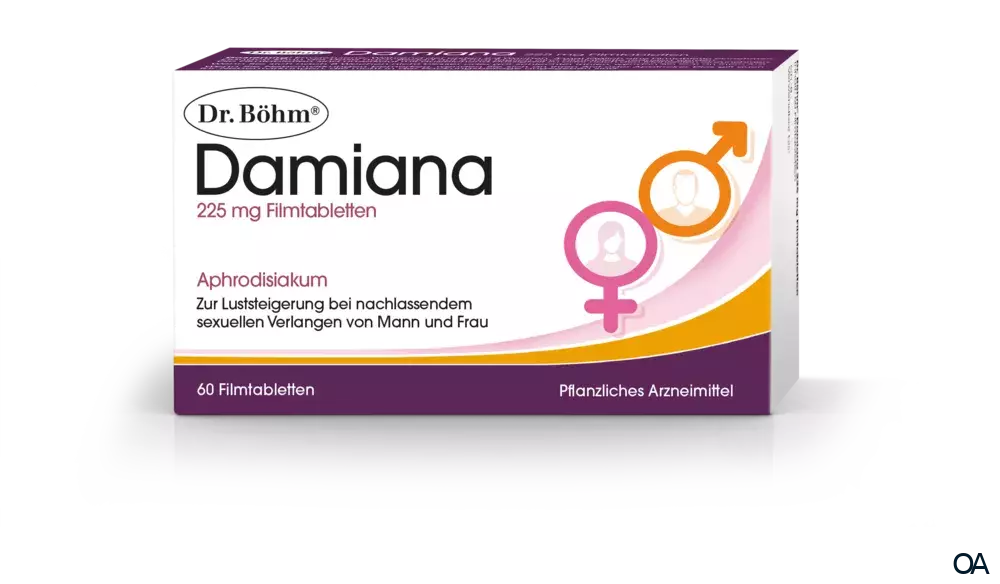 Dr. Böhm® Damiana 225 mg Filmtabletten sind ein traditionelles pflanzliches Arzneimittel und enthalten einen Extrakt aus den Blättern von Damiana (wissenschaftliche Bezeichnung: Turnera diffusa). In der mittel- und südamerikanischen Volksmedizin finden die Blätter der Damianapflanze seit Jahrhunderten Verwendung, insbesondere als luststeigerndes Mittel (Aphrodisiakum).
