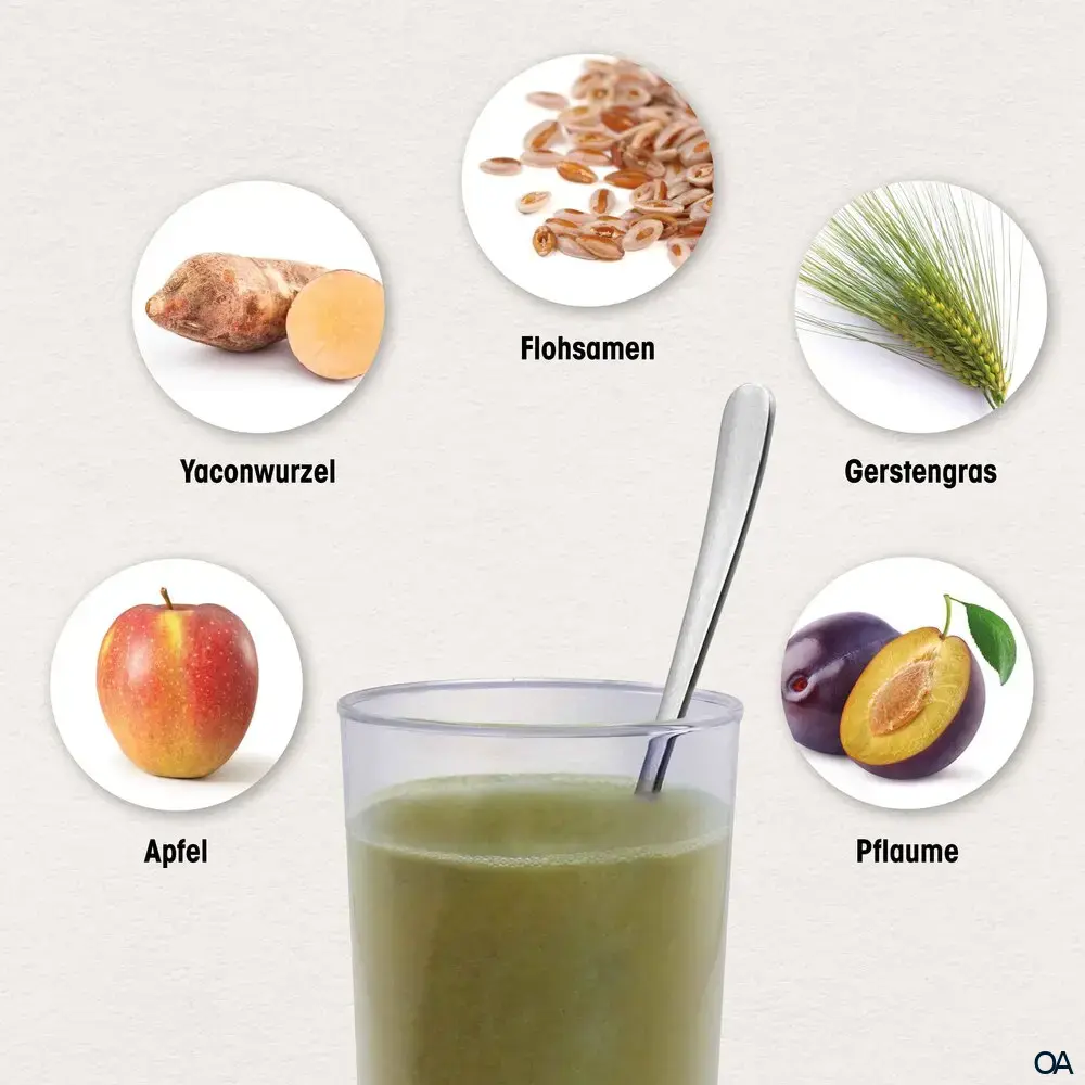 Zusammensetzung pro 1 Sachet %NRV*: Flohsamenschalenpulver 2000 mg, Gerstengraspulver 200 mg, Pflaumenpulver 200 mg, Yaconwurzelpulver 200 mg, Apfelpektin 400 mg entspricht Gesamtballaststoffe von 2110 mg, Kümmel-Extrakt 300 mg, Magnesiumsulfat 929 mg entspricht Magnesium 188 mg 50 %, Biotin 75 μg 150 %. *NRV = Tägliche Nährstoffbezugswerte in %. 1 Sachet enthält 0,21 BE. 1 Sachet = 8,11 kcal / 34,06 kJ.