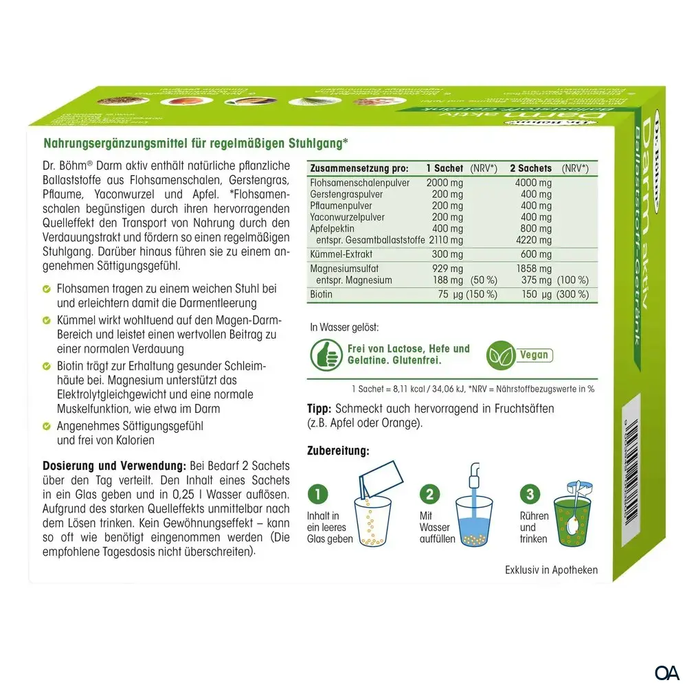 Die Dr. Böhm® Darm aktiv Trinkpulver natur Sachets sind ein Nahrungsergänzungsmittel zur Anregung der Darmtätigkeit* mit pflanzlichen Ballaststoffen aus *Flohsamen, Gerstengras, Pflaume, Apfel, Yaconwurzel und wohltuendem Kümmel.