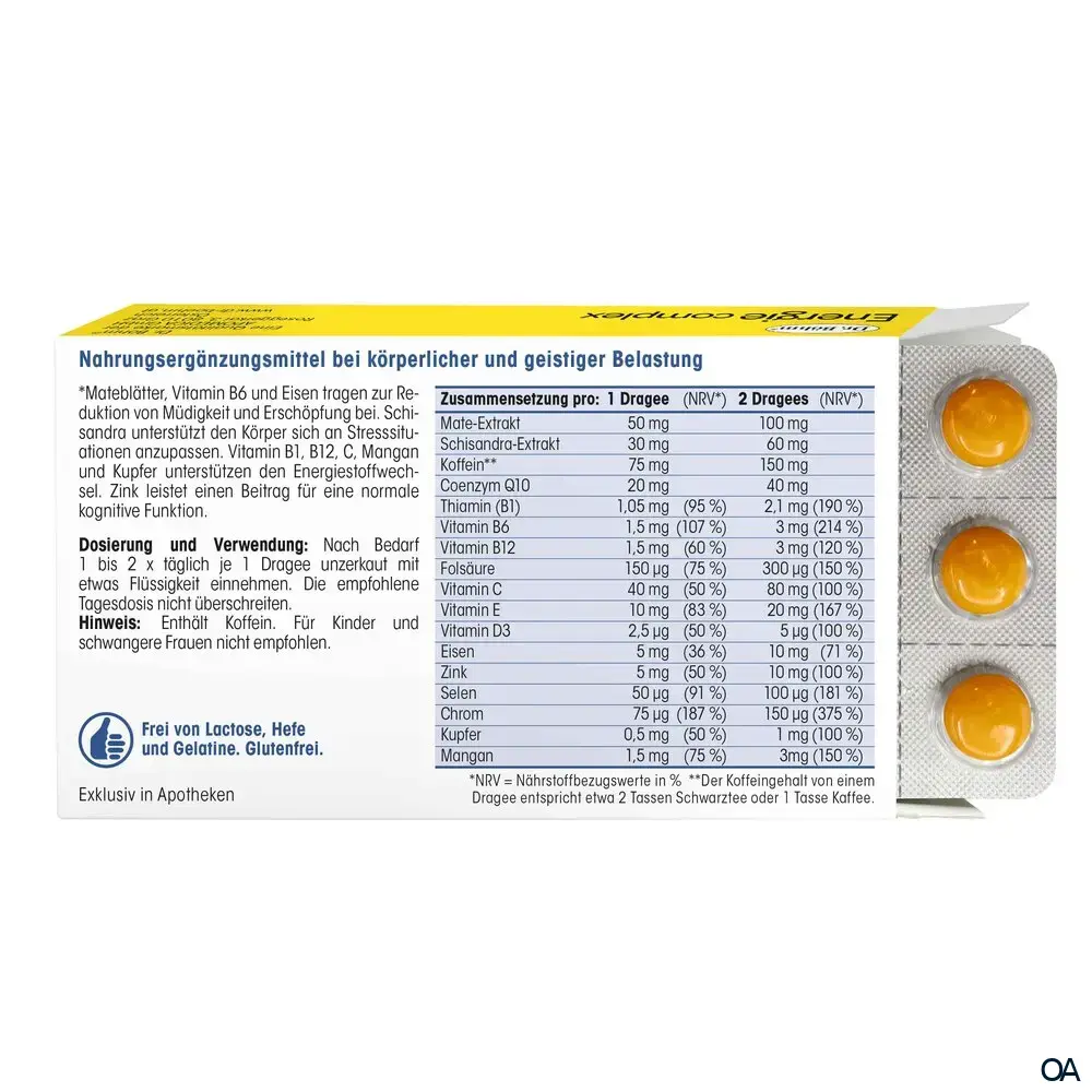 - Zusammensetzung pro Dragee (NRV*): Mate-Extrakt 50 mg, Schisandra-Extrakt 30 mg, Koffein1 75 mg, Coenzym Q10 20 mg, Thiamin (B1) 1,05 mg (95 %), Vitamin B6 105 mg (107 %), Vitamin B12 1,5 mg (60 %), Folsäure 150 μg (75 %), Vitamin C 40 mg (75 %), Vitamin E 10 mg (83 %), Vitamin D3 2,5 μg (50 %), Eisen 5 mg (36 %), Zink 5 mg (50 %), Selen 50 μg (91 %), Chrom 75 μg (187 %), Kupfer 0,5 mg (50 %), Mangan 1,5 mg (75 %). *NRV = Nährstoffbezugswerte in %. 1Der Koffeingehalt von einem Dragee entspricht etwa 2 Tassen Schwarztee oder 1 Tasse Kaffee.