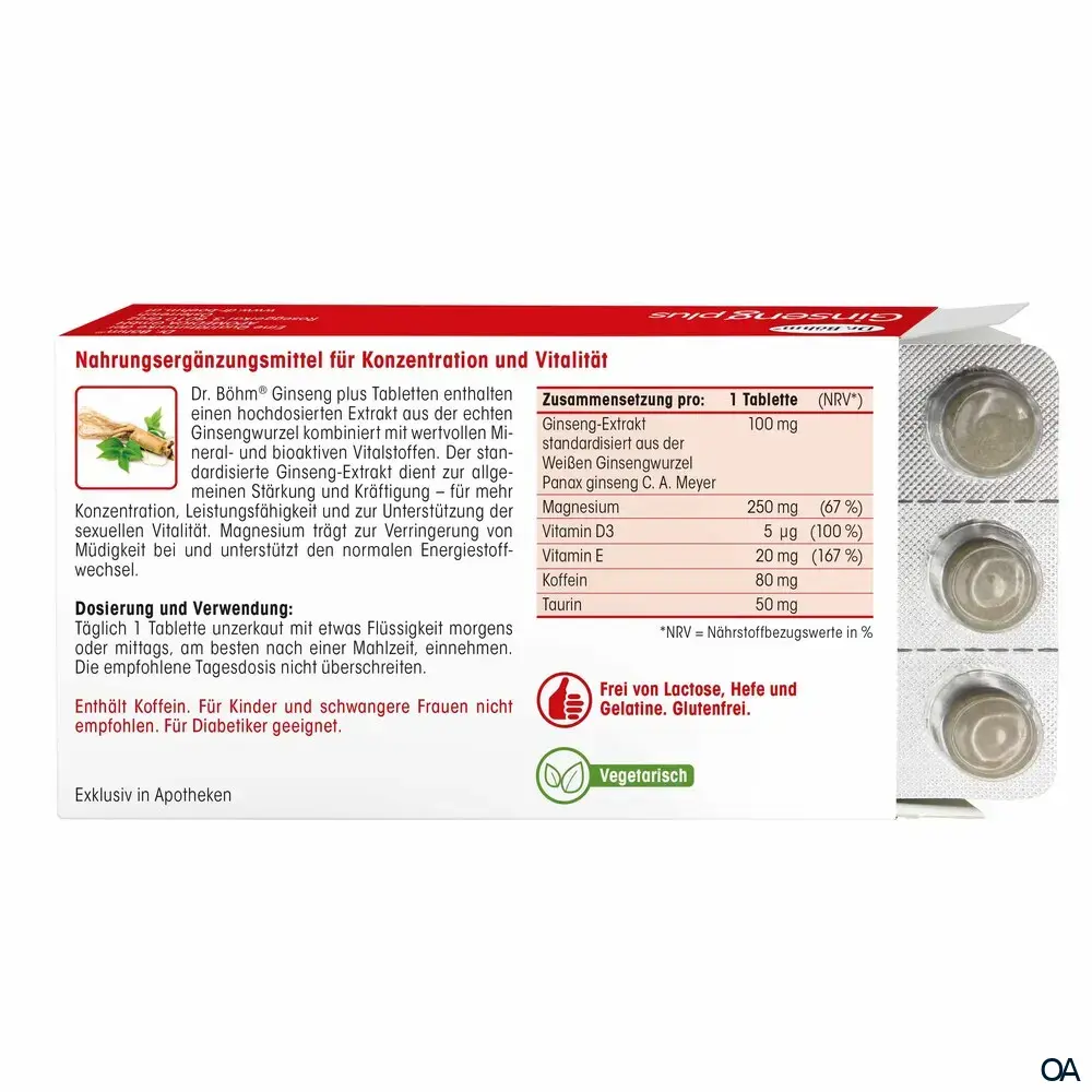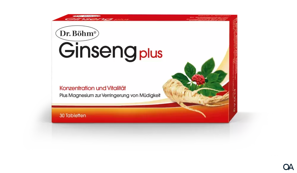 Dr. Böhm® Ginseng plus Tabletten sind ein Nahrungsergänzungsmittel zur Unterstützung für eine gesteigerte Konzentration und Vitalität! Plus Magnesium zur Verringerung von Müdigkeit.