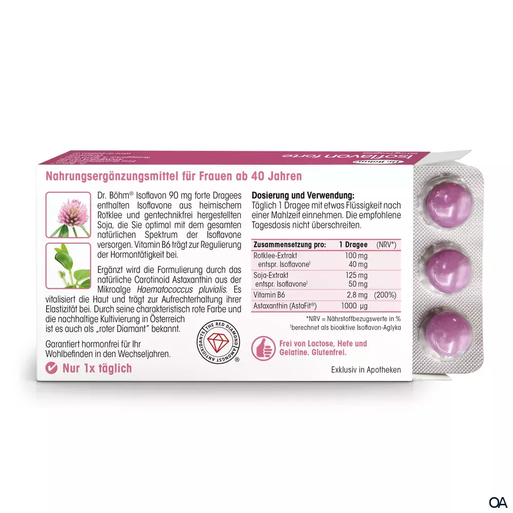 Dr. Böhm® Isoflavon forte 90 mg Dragees sind ein Nahrungsergänzungsmittel für eine hormonelle Balance für die Frau ab 40! Wohlbefinden in den Wechseljahren. Regulierung der Hormontätigkeit mit Vitamin B6 plus Astaxanthin für die Hautelastizität.