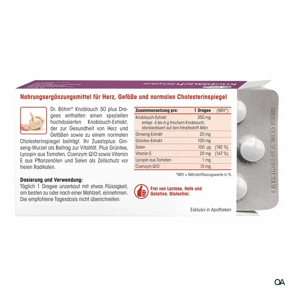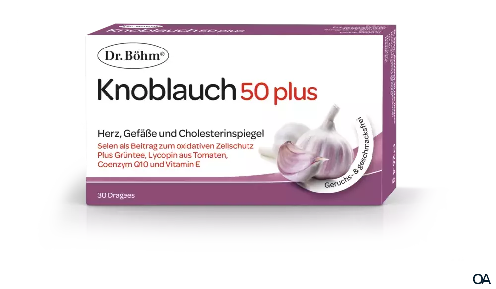 Die Dr. Böhm® Knoblauch 50 plus Dragees sind ein Nahrungsergänzungsmittel mit einem speziellen hochdosierten Knoblauch-Extrakt zur Unterstützung für Herz, Kreislauf und Gefäße sowie einen normalen Cholesterinspiegel.
