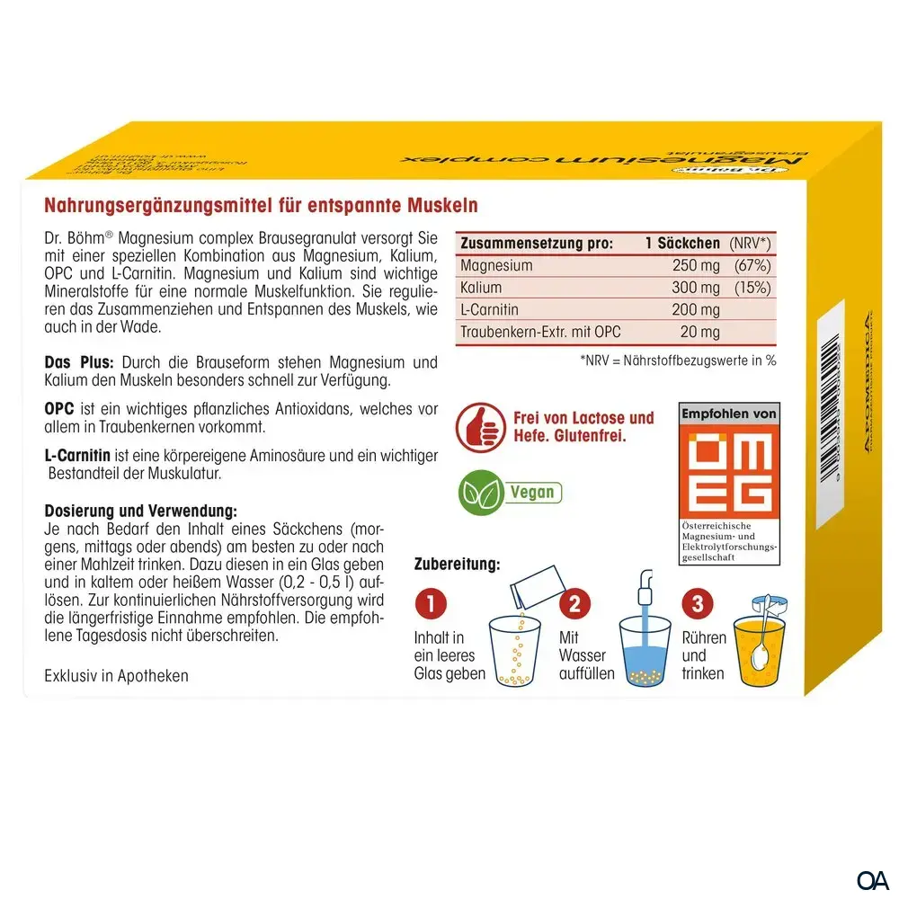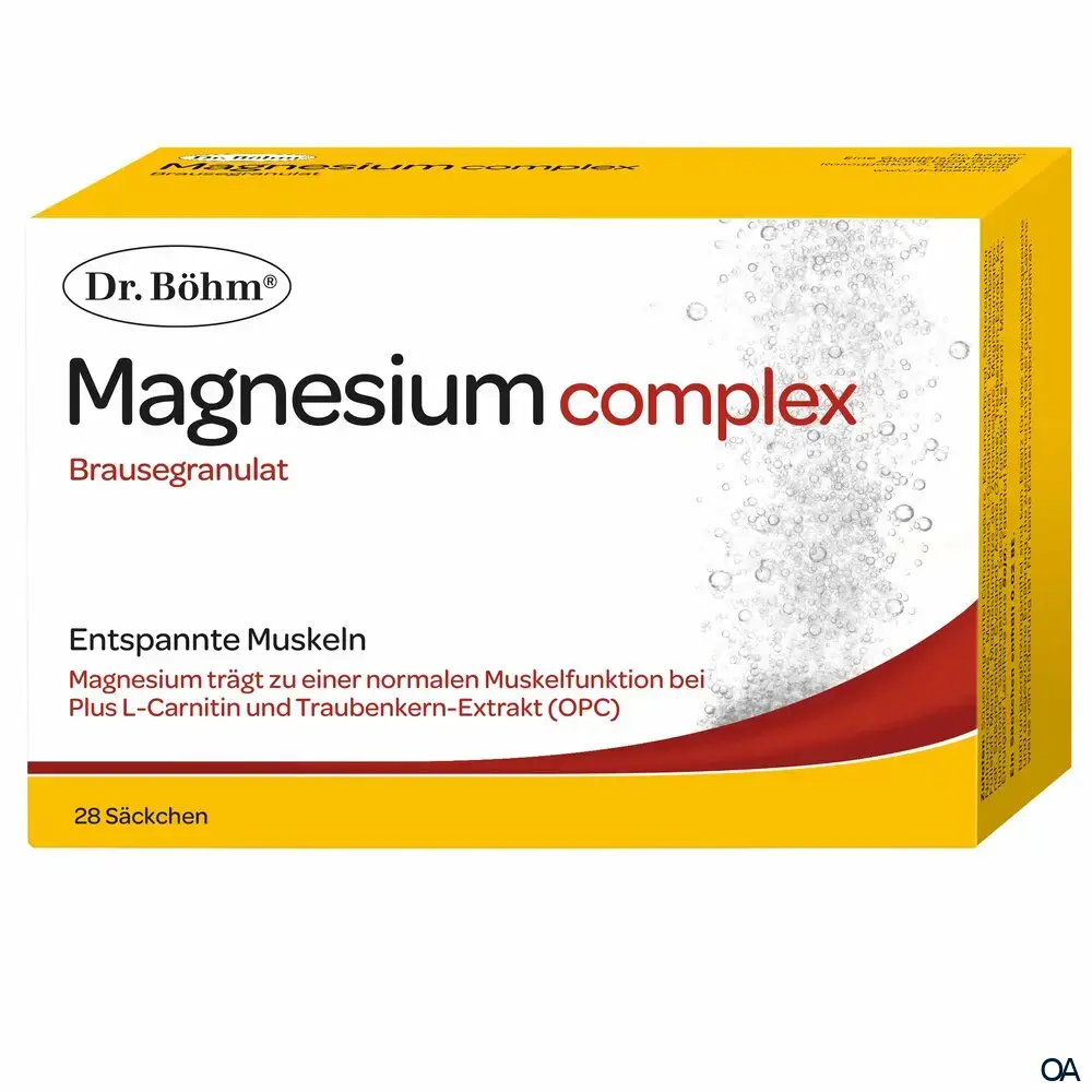 Dr. Böhm® Magnesium complex Brausegranulat sind ein Nahrungsergänzungsmittel zur Unterstützung für entspannte Muskeln – Magnesium für die Nacht! Magnesium trägt zu einer normalen Muskelfunktion bei plus L-Carnitin und Traubenkern-Extrakt (OPC).