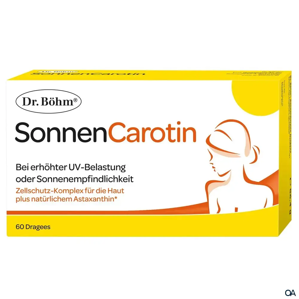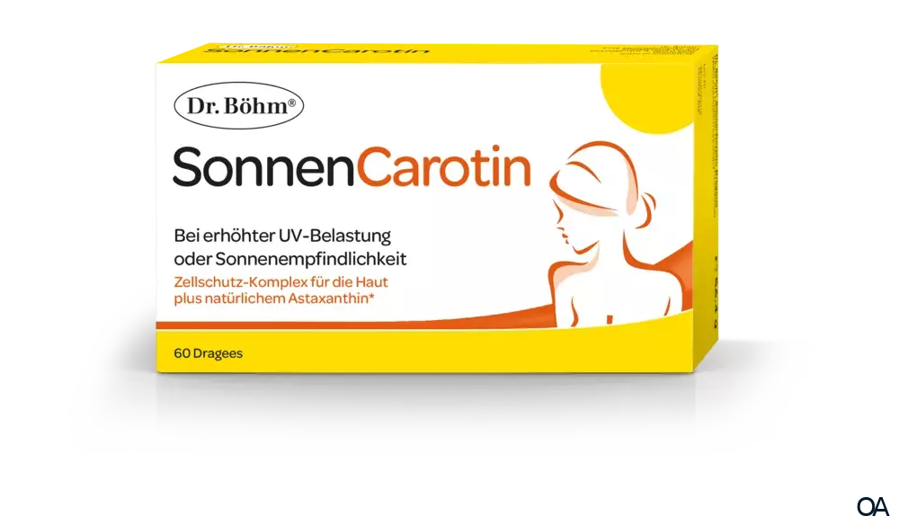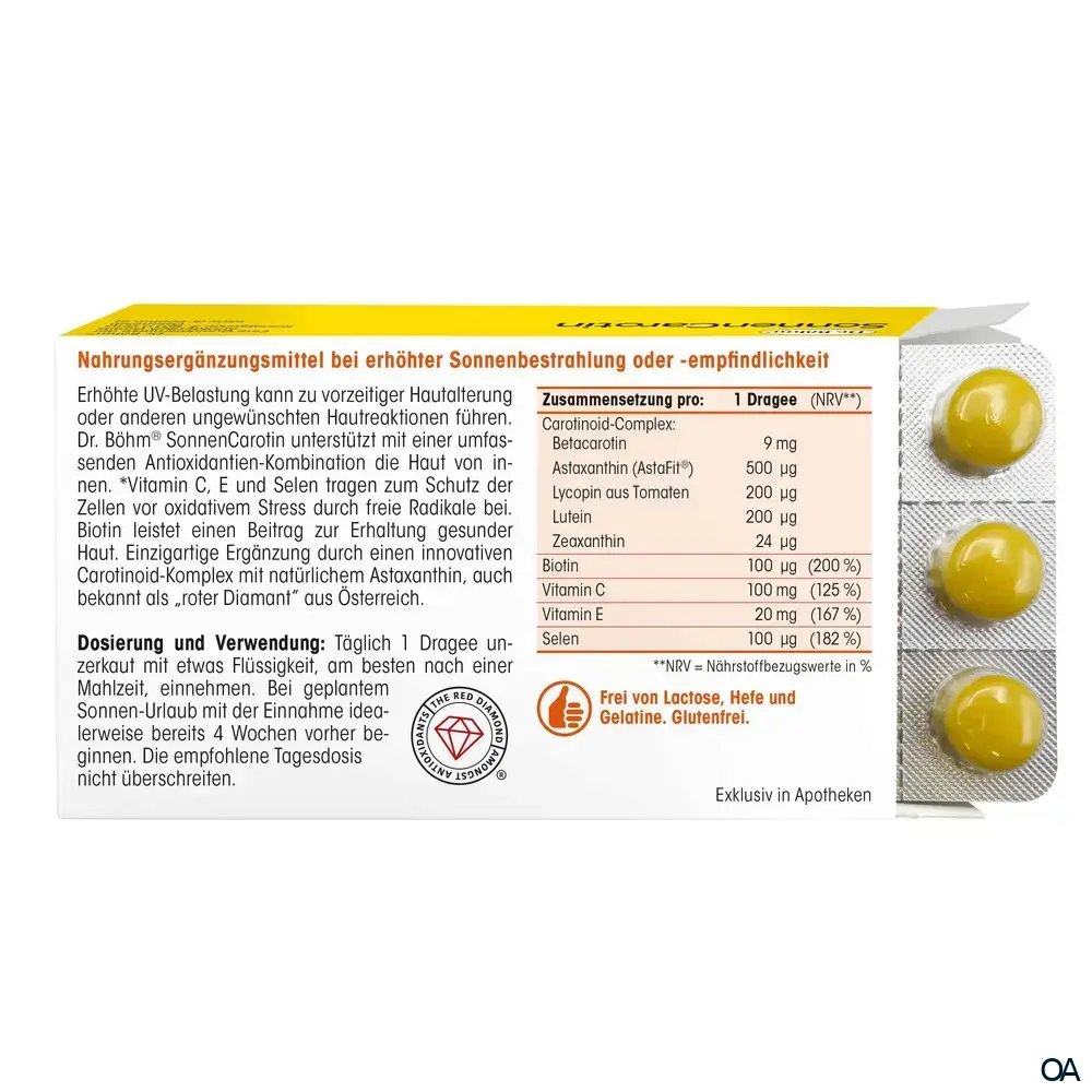 - Warnhinweise: Dr. Böhm® SonnenCarotin Dragees sind kein Ersatz für Sonnenschutzprodukte zur äußerlichen Verwendung, können das Schutzpotenzial jedoch sehr gut ergänzen.