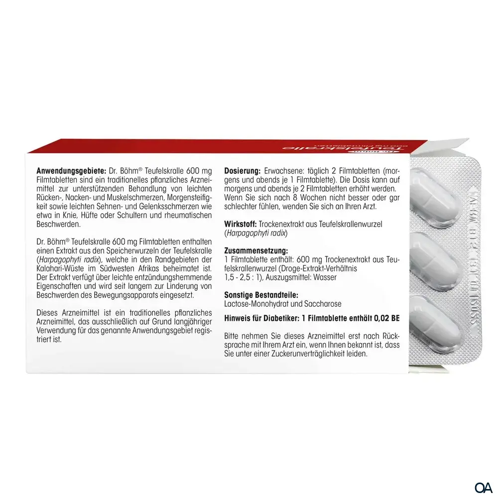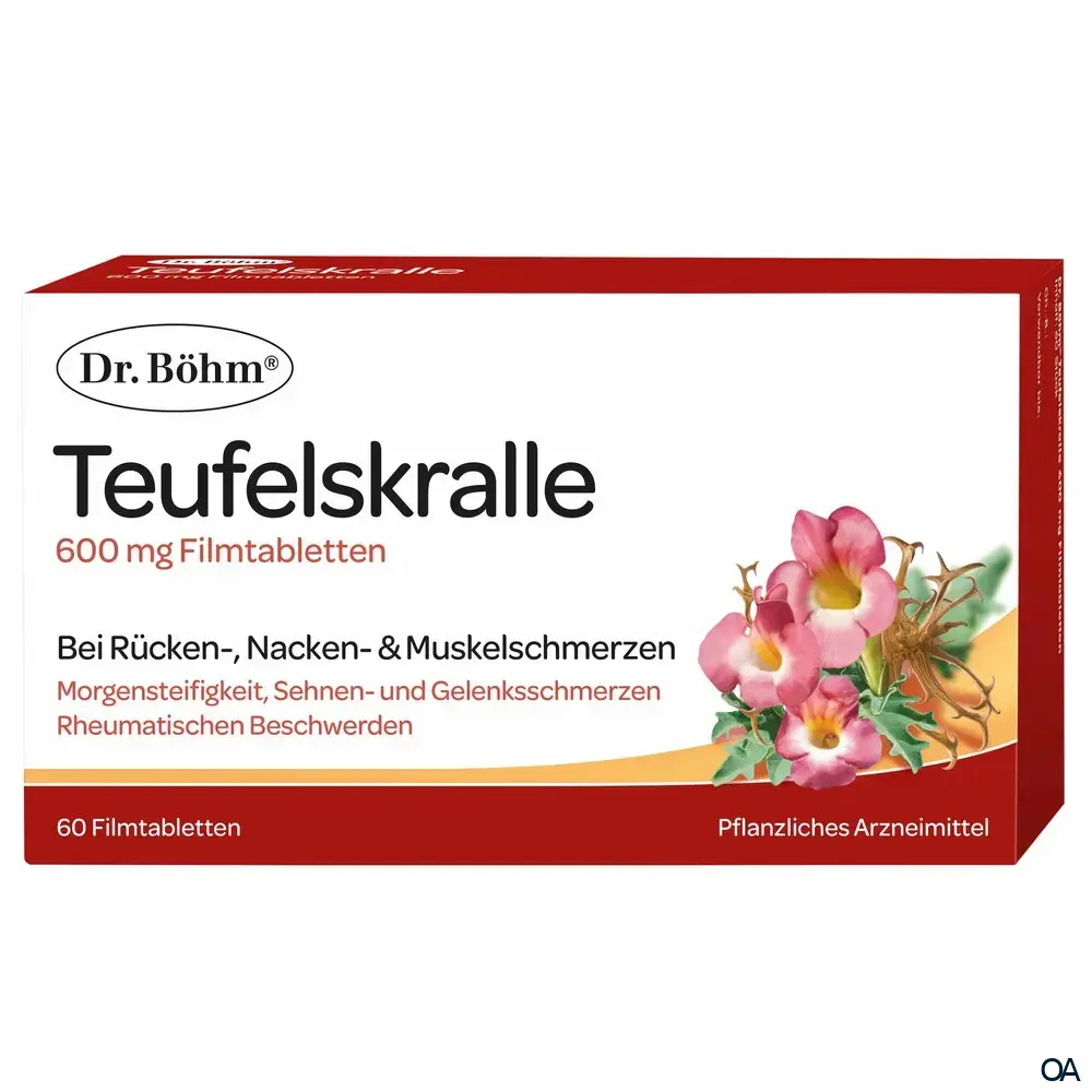 Die Dr. Böhm® Teufelskralle 600 mg Filmtabletten sind ein pflanzliches Arzneimittel zur unterstützendend Behandlung bei Rücken,-Nacken,- und Muskelschmerzen, Morgensteifigkeit sowie leichten Sehnen-und Gelenksschmerzen.