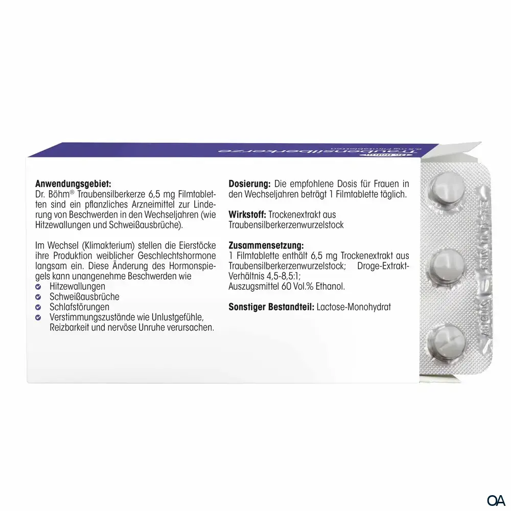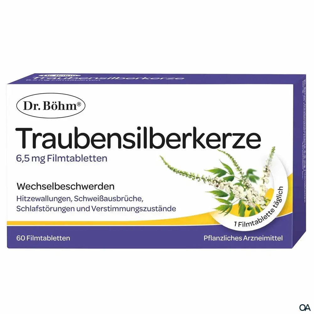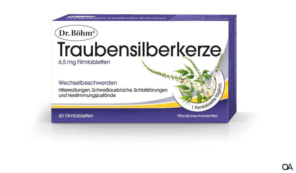 Die Dr. Böhm® Traubensilberkerze 6,5 mg Filmtabletten sind ein pflanzliches Arzneimittel zur Linderung von Beschwerden in den Wechseljahren (wie Hitzewallungen und Schweißausbrüche).